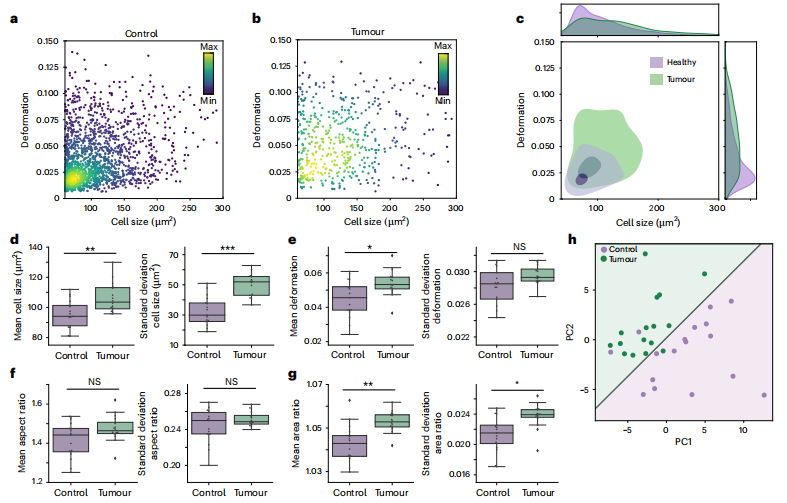 研究团队将小鼠结肠肿瘤中分离的细胞与来自同一动物结肠健康部位的细胞进行了比较。结果表明,来自肿瘤组织的细胞的物理表型与对照样品显著不同。相比健康细胞,来自肿瘤的细胞具有显著更高的平均细胞大小和更高的变形以及面积比(图d)。肿瘤样品也表现出更大的异质性,细胞大小和面积比具有显著更高的标准偏差(图d,g)。统计结果显示,形变和细胞大小是小鼠结肠样本中肿瘤的独立预测因素。
