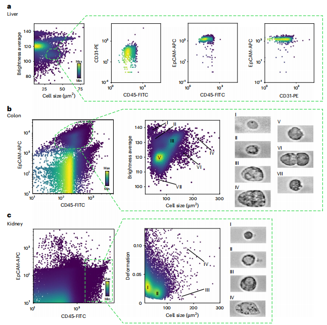 从肝脏、结肠和肾脏提取的细胞的物理参数分布的示例如下图。这些簇中的每一个都由具有相似物理表型和表面标记表达的细胞组成。例如,具有类似物理性质的细胞簇(本例由平均亮度和细胞大小定义)主要由上皮细胞粘附分子(EpCAM)阳性细胞组成,这表明可以完全使用图像衍生的物理参数以无标签的方式区分上皮细胞群。