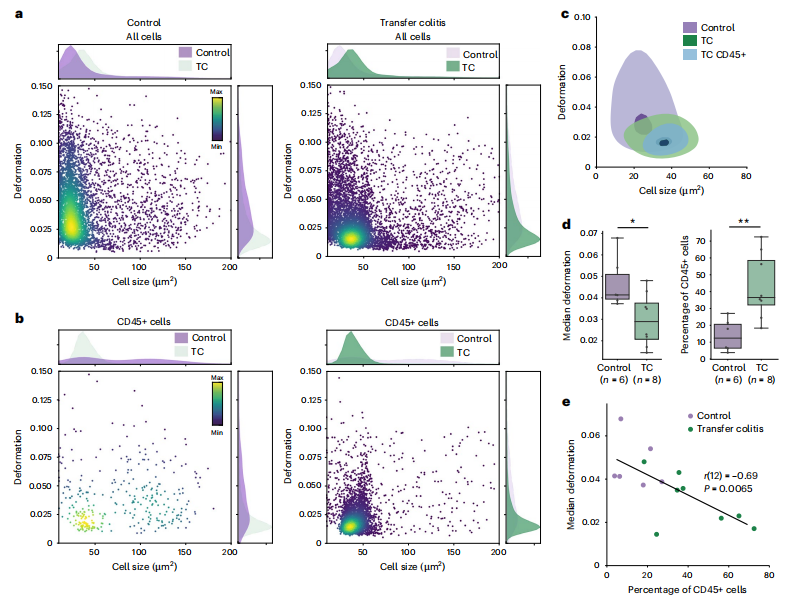 通过研究转移性结肠炎过程中结肠细胞物理表型的变化可知,形变与细胞大小的散点图表明疾病和健康组织之间存在差异(图a)。总的来说,转移性结肠炎样本中形变中值显著减小,同时白细胞的百分比显著增加,这与过继转移的淋巴细胞浸润一致(图d)。