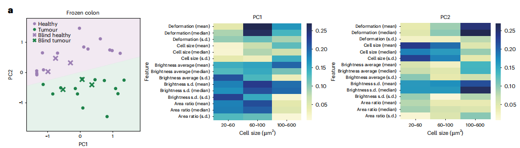 研究团队对从13个冷冻保存的结直肠癌癌症活检样本和13个来自相同患者的健康周围组织样本中分离的细胞进行了RT-FDC分析。对45个参数进行主成分分析,结果表明,肿瘤和健康样本沿着PC2很好地分离,主要是通过细胞的形变和大于100 µm2细胞的亮度标准偏差(图a)。PCA与逻辑回归相结合,用于预测六个盲样本的分类,所有六个样本均被正确分类为健康组织或肿瘤组织。