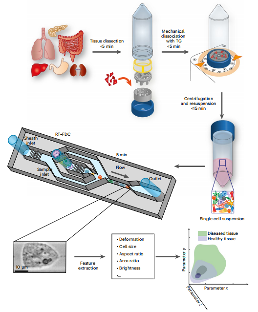 在这篇文章中, 研究团队提出了一种快速、无标签的固体组织活检诊断方法。该方法结合了使用组织研磨机(TG)对组织进行无酶机械解离,以快速简单地分离活的单细胞,以及使用RT–FDC对数千个单细胞的细胞物理表型进行连续评估。 结果表明,此方法可以基于微流体系统中细胞形变的测量来确定结肠组织中的炎症变化,以及可以区分健康组织和癌组织。这个流程可以在30分钟内交付结果 ,具有作为术中诊断流程的潜力,可以灵敏地检测活检中的病理变化,更广泛地说,可以以无偏见和无标记的方式识别和表征组织中的细胞群。