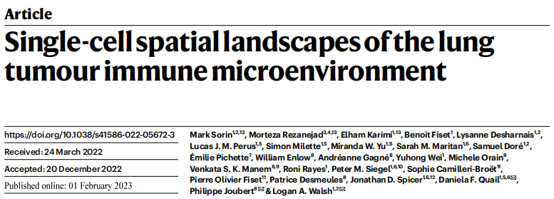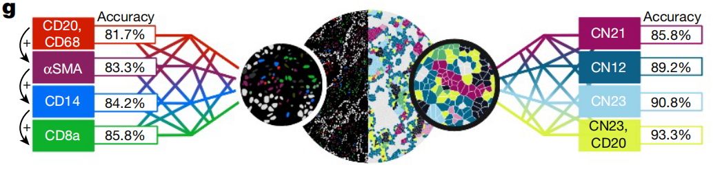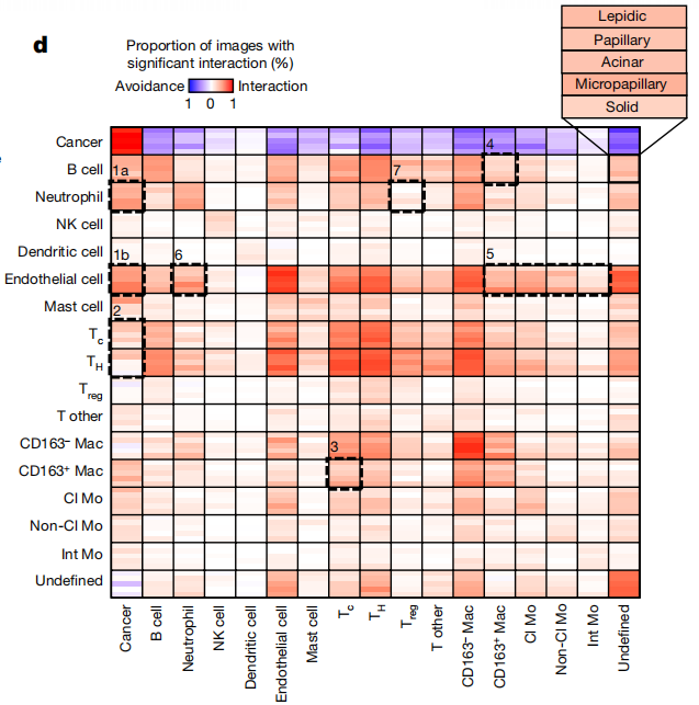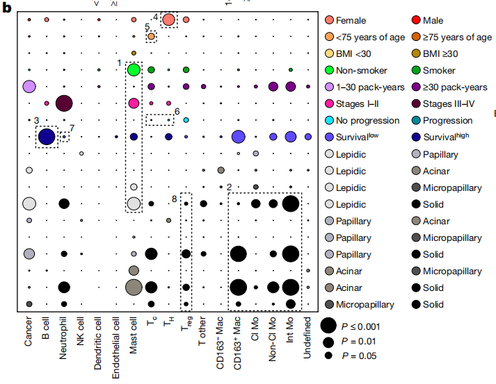 肺癌是癌症相关死亡的主要原因,占所有癌症死亡人数的20%以上。肺腺癌(LUAD)是一种非小细胞肺癌(NSCLC),是最常见的亚型,具有明显的细胞和分子特征。肿瘤免疫微环境(TIME)是LUAD异质性的主要来源,并影响疾病进展和对治疗的反应。已知免疫细胞在肿瘤内的定位决定其功能;因此,了解肺癌TIME的空间景观将为疾病进展提供机制见解,并揭示对现有治疗的反应生物标志物。 近日,一组来自加拿大的研究团队在杂志nature上发表了一篇题为“Single-cell spatial landscapes of the lung tumour immune microenvironment”的文章。这篇文章中,研究团队使用高度多重成像质谱流式细胞术(IMC),研究了与LUAD患者的临床结果相关的TIME的空间特征。使用深度神经网络模型,证明了使用基于人工智能的系统可以从原始IMC图像中提取的特征来预测各种临床结果,比如疾病进展,这可能会指导未来的术后管理。 图片来源:Nature LUAD肿瘤免疫微环境 为了表征肺TIME的细胞景观,研究团队将IMC应用于416名LUAD患者的样本。使用35-plex抗体组来识别癌症细胞、间质细胞以及具有不同功能亚群的先天性和适应性免疫谱系。总的来说检测到1644178个细胞,并对14个不同的免疫细胞群体以及肿瘤细胞和内皮细胞进行分类(如下图)。 与微乳头状、腺泡样、乳头状和鳞状亚型(分别为37.0%、39.7%、32.8%和32.7%)相比,高级别实性亚型具有最大的免疫浸润(44.6%)。巨噬细胞是肺TIME中最常见的细胞群,占总细胞的12.3%,占免疫细胞的34.1%,这与它们在NSCLC niche中的关键作用一致。CD163+巨噬细胞在实体瘤中富集最高,这是最具侵略性的群。且CD163+巨噬细胞的比例与实体模式中的FOXP3+免疫调节T细胞(Treg细胞)密切相关。这些关联表明,在LUAD模式中,巨噬细胞和T细胞群体之间存在潜在的相互作用,证明了肺TIME中存在的复杂异质性。 IMC定义了LUAD的空间景观。图片来源:Nature LUAD免疫群体的富集 评估免疫群体与临床或病理变量(性别、年龄、体重指数(BMI)、吸烟状况、分期、进展、生存率和组织学亚型)之间的关系(如下图b)。尽管肥大细胞与延长生存期有关,但它们在非吸烟者、早期患者和鳞状肿瘤患者中的比例过高。相比之下,B细胞频率与更好的总生存率最显著相关,与任何临床或病理变量无关。 除了生存相关性之外,还发现了细胞频率和特定临床亚组之间的关系。例如,T细胞亚群表现出基于性别和年龄的特异性富集。CD4+辅助性T细胞在女性患者中显著富集(图b,框4),她们的总生存率高于男性患者。年龄较大的患者(75岁以上)瘤内CD8+T细胞较少。总的来说,这些数据揭示了新的关系,并为TIME内细胞频率和临床结果之间已建立的关联增加了生物学见解。 LUAD免疫群体的富集情况。图片来源:Nature LUAD多细胞空间相互作用 研究团队通过量化细胞-细胞的空间关系来表征单个细胞之间的直接相互作用和通信模式。结果表明细胞-细胞相互作用的空间关系比单独的细胞频率具有更大的预后价值。与低级别亚型相比,在实性和微乳头状亚型中,中性粒细胞和内皮细胞与癌症细胞的相互作用都有增加的趋势(图d),与中性粒细胞促进血液源性转移相一致。 在鳞状和乳头状肿瘤中,CD8+和CD4+T细胞与癌症细胞的相互作用趋势强于实性LUAD,呼应了T细胞和肿瘤细胞的空间相互作用是不复发的标志。CD163+巨噬细胞和CD8+T直接相互作用的趋势在高级别肿瘤中最强,并且随着肿瘤级别的降低而降低(图d),这与CD163+巨噬细胞在TIME内抑制CD8+T细胞功能的作用一致。B细胞在高级别肿瘤中更倾向于与CD163+巨噬细胞相互作用。最后,与低级别肿瘤相比,高级别肿瘤中的内皮细胞倾向于与许多免疫群体相互作用,包括CD163+巨噬细胞和单核细胞。总之,这些分析说明了空间关系(而不仅仅是细胞频率)对理解TIME生物学非常重要。 LUAD多细胞空间相互作用。图片来源:Nature LUAD空间景观和生存率 接下来探讨了微环境中的细胞表型与生存率的关系。研究团队观察到增殖性Ki-67+内皮细胞群体,其频率与总生存率低有关。内皮细胞的增殖是缺氧时血管生成的基础,并发现在高级别肿瘤中内皮细胞与中性粒细胞的相互作用富集。基于三种标记物的表达模式观察到了几种中性粒细胞状态:HIF1α+、ARG1+和MMP9+。尽管总中性粒细胞的高频率与生存率无关,但HIF1α+亚群比例的增加与较差的总生存率显著相关。中性粒细胞在高级别肿瘤中表现出与免疫抑制Treg细胞相互作用的更高趋势。CD4+T细胞亚群内的活性ERK信号传导与延长生存期有关,因为其抑制向Treg细胞的分化。总之,这些发现提供了与更具侵袭性的肿瘤相关的空间表型的信息。 鉴于B细胞的预后价值,研究团队更详细地分析了B细胞邻域(cellular neighbourhood, CN)。在四个B细胞富集的邻域(CN7、CN11、CN21和CN25)(下图d)中,当CNs同时显示Treg细胞(CN7和CN21)富集时,与B细胞相关的生存优势被抵消;而当Treg细胞较低时,CN11和CN25保持了生存优势。数据表明,CN25生存相关性的改善与B细胞和CD4+辅助T细胞的相互作用有关,而Treg细胞的富集仍然足以抵消这种生存益处,强调了多细胞在TIME相互作用的重要性。 LUAD空间景观和生存率。图片来源:Nature 使用深度学习预测结果 接下来研究团队想知道是否可以利用空间数据通过使用深度学习方法来预测临床结果。通过使用预先训练的卷积神经网络模型来进行迁移学习。首先评估了每个图像中单独的细胞频率是否足以预测临床变