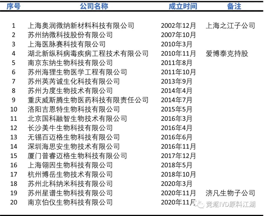 正是基于上述原因,我一直认为在化学发光试剂的各种核心原料中,磁珠的国产替代最为不易且遥遥无期(可参考《化学发光集采对试剂原料国产化的影响》),国产磁珠的市场推广难度最大,因此,我对国产磁珠供应商抱有极大的敬意,他们能够直面挑战,进入并坚守这一战线,本身就是一种成功。特将国产磁珠供应商罗列于下,按成立时间先后排序,以飨读者;难免有所遗漏,乃个人水平所限,欢迎大家补充。