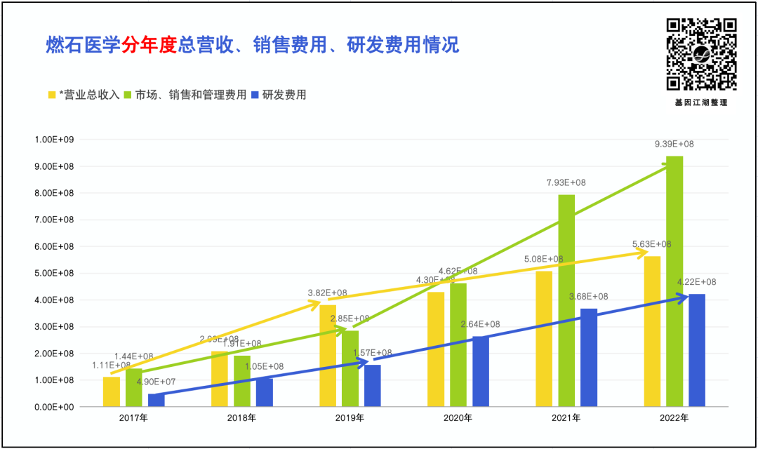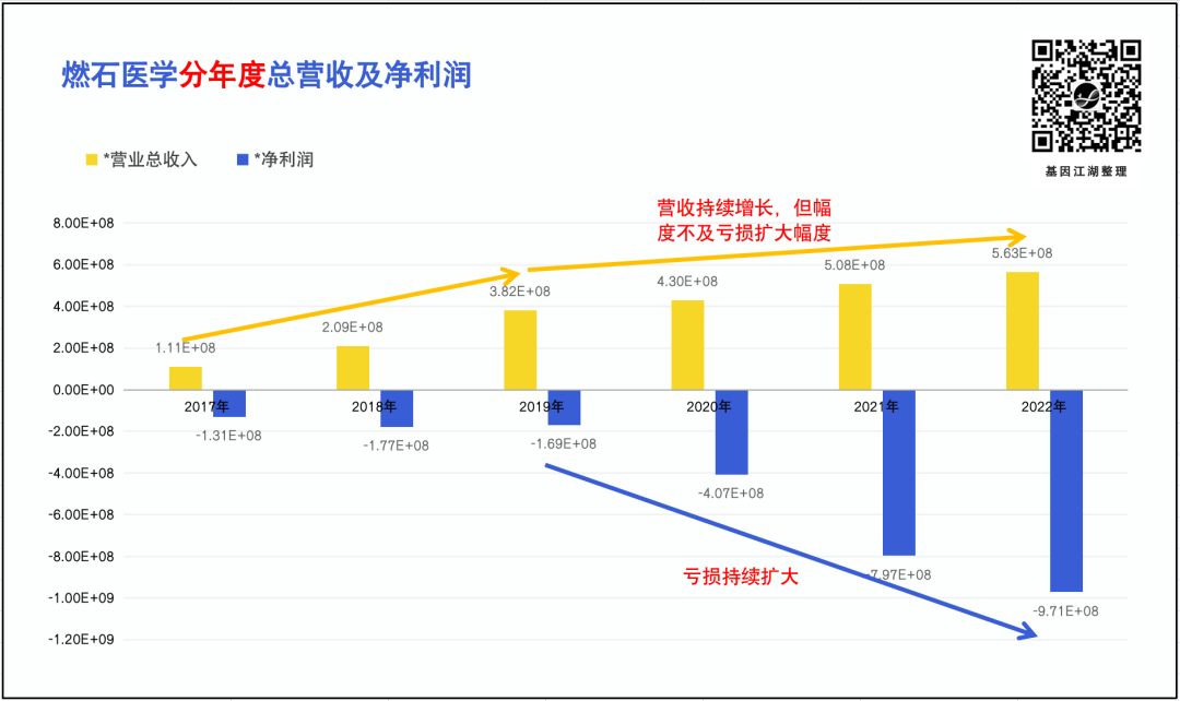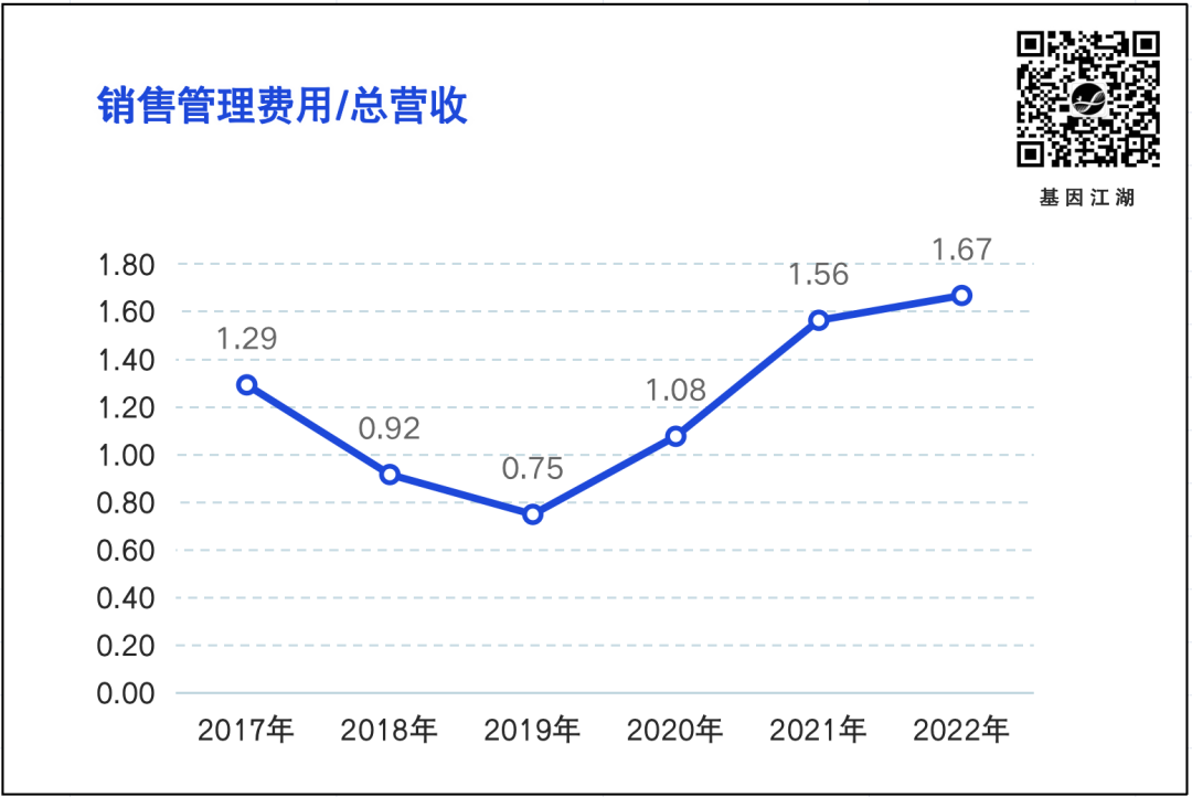 | 2014年,35岁的汉雨生离开投资圈,躬身入局,创办燃石医学。仅仅6年,2020年6月,燃石医学迎来高光时刻,成功登陆美国纳斯达克,成为国内肿瘤基因检测第一股。汉雨生在湖畔大学做过一次演讲,谈到“燃石医学”名字的由来:“当时起‘燃石’这个名字的时候,我们有一个寓意。我们觉得精准医疗这个事情在未来会显著深远地去改变整个行业的生态格局,就像六千五百万年前小行星撞击地球一样,毁灭了旧的生态秩序,重新建立新的生态秩序,哺乳动物代替爬行动物开始繁荣。燃石就是这样的一股力量。” ( 📎 名字打架:聊聊NGS公司起名往事 ) 燃石医学的发展之路,就是肿瘤基因检测发展的历史; 燃石医学如今所面临的难题,就是肿瘤基因检测公司、甚至是所有NGS临检公司所面临的难题。行业困顿之下,没有“一鲸落而万物生”,只有“一荣俱荣、一损俱损”。当我们开始突然提起,燃石能不能活下去的时候,这个行业,确实遇到了一些难以解决的问题。(本文所有数据均来自官方财报,从结论来说,并无太多新意;从商业模型来说,更不严格。仅供大家在数据层面做一些佐证。如能从中看到行业面临的难题和可能破局的方向,欢迎留言区讨论。)5月底,燃石医学在自家公众号平台,发布了2023Q1季度报解读。这个动作并不常见,应该是有一些好的讯息释放给市场。文中提到,2023年Q1总营收同比增长5.2%;院内业务同比增长5.3%;药企合作延续迅猛增长势头,同比增长135.9%;重申2023年全年收入预期比2022年增长约20%。 如图所示,燃石医学总营收持续增长,从2017年的1.11亿 → 2022年5.63亿;净利润方面,2019年后,亏损迅速扩大,且扩大幅度远高于营收增长幅度。 市场、销售和管理费用在2019年后迅速增长,且在2020年超过公司总营收;(注意黄绿两线交汇点,这也是燃石上市节点。)销售/管理费用的大幅增长,并没带来总营收的同比例放大,边际效应递减。以一个更直观的图看这种变化,用“销售管理费用/总营收”(即:每挣1元钱,需花费多少元钱销售管理费用),可得下图:(ps:以方便更直观理解,是否有类似商业模型,敬请读者朋友告知。)
