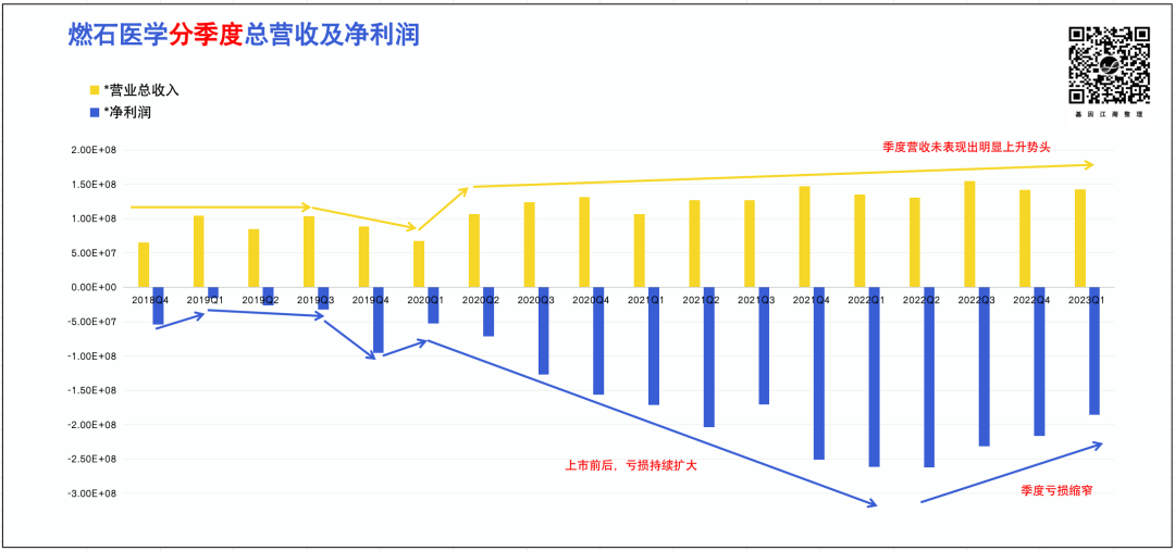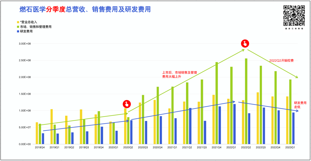 回顾燃石2017-2022年发展历程,有两个关键时间点(如图中手型标识): 1. 2020年Q2前后,燃石上市,开始狂奔之路,伴随亏损持续扩大; 2. 2022年Q2前后,可能意识到该模式无以为继,叠加二级股票市场表现不佳,开始有意识控费。