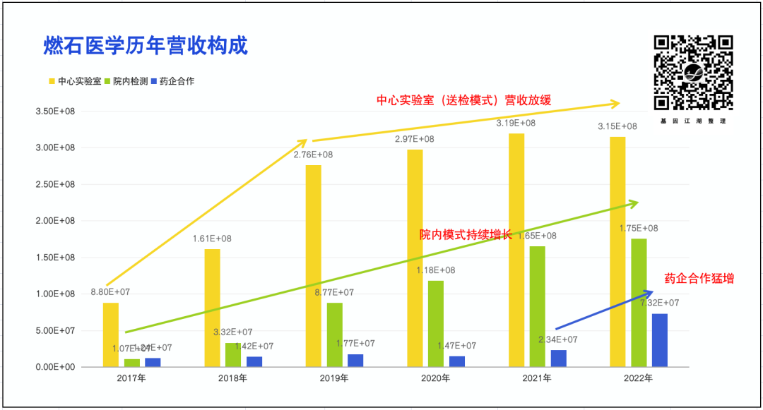 裁员、砍项目等“节流手段”也只是燃石自救的无奈之举,但一味节流,也只能活得更久一些,无法真正自救。关键还在“开源”。 中心实验室(外送模式)仍是总体营收大头,占比超过50%;但2019年后,中心实验室增长势头明显放缓; 院内检测模式持续增长;药企合作项目在2021年迎来大的突破;