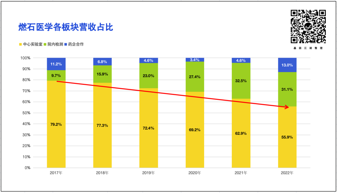 可以看出,2022年药企合作部分已占总营收的13%;中心实验室模式对总体营收的贡献持续下降(2017年79.2%→2022年55.9%),而院内模式贡献逐渐提升,这也反应了燃石正持续推动中心实验室业务向院内业务的转化。为什么这么做?