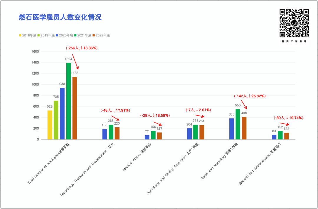 2020年年中上市后,燃石从2020年底的938人,迅速增长至2021年底1394人,增幅高达48.61%。其中以医学事务部门增长最为迅猛(77→156人,↑102.6%)。 2022年Q2来临,公司开始控费。员工总数从2021年1394人,缩编至1138人,降幅达18.36%。如图所示,各个部门均有裁员,其中以销售市场人员削减最为明显(550→408人,↓25.82%,ps:也可能与中心实验室模式向入院模式转变有关)。研发人员在2022年度亦削减48人,占研发总人数的17.91%,可以预见,研发项目同步缩减。数百人燃石一年游,燃石的毕业生们,应感慨良多。但更多企业亦步亦趋。