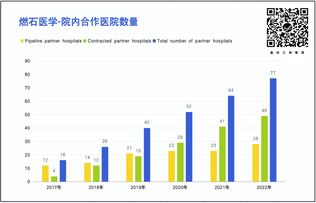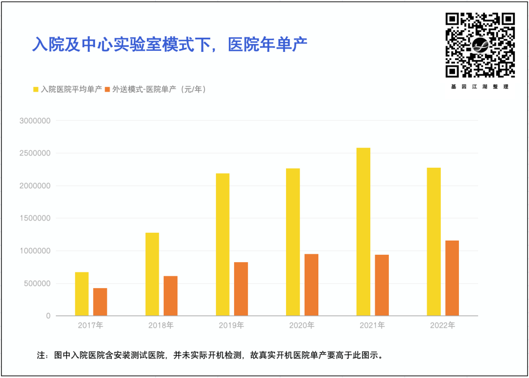 入院模式下,医院年均产出远高于送检模式下医院产出(200w~500w vs 100w)。1. 药企合作部分尽管增长势头较好,但市场空间受限;且竞争加剧明显(其他大厂也在重点投入药企合作部分); 2.除伴随诊断、MRD外,缺乏对营收有巨大贡献的单品;暂不谈早筛项目;乐观的是,燃石相较其他厂家,拥有更多的院内开机医院(2022年,77家),这才是燃石未来发展的基石。👇