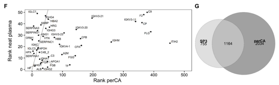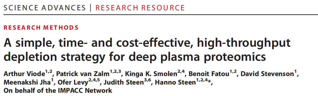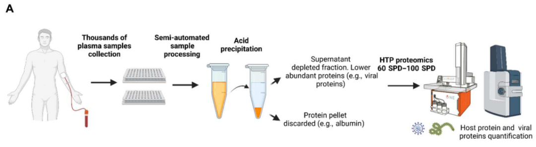 血浆作为潜在生物标志物来源的重要性不言而喻;作为全球收集最多的生物流体,它用于约40%的临床测试。因此,血浆已成为许多学术、药理学、生物医学和临床研究的焦点,因为它是生物标志物的宝贵来源。然而,鉴定血浆中的蛋白质生物标志物受到了限制,因为血浆中最丰富的22种蛋白质占所有蛋白质含量的99%,从而阻止了使用基于质谱(MS)的蛋白质组学检测不太丰富的蛋白质。因此,在大多数纯血浆蛋白质组学研究中,只有最丰富的~300种蛋白质,即“经典血浆蛋白质”,才能可靠地检测到。 临床相关生物标志物的研究受益于高通量(HTP)蛋白质组学方法,以分析具有数百或数千个样本的队列。因此,过度分离和昂贵的基于抗体的方法是不可行的选择:过度分离严重影响使用液相色谱(LC)/MS的通量,而基于抗体的方法非常昂贵,并且对于具有可变pH和/或盐浓度的生物样品来说不够稳健。 一个理想的去除高丰度蛋白流程必须满足以下要求:(i)具有HTP能力,即能够处理和分析大量血浆样本;(ii)成本低;(iii)时间短;(iv)批次效应小;和(v)能够以比经典血浆蛋白质组更低的浓度可靠地检测血浆蛋白质。这些丰度较低的蛋白质主要来源于组织,显示出病理学特异性的丰度差异,并可能代表影响广泛器官的疾病的早期检测的候选生物标志物。 近日,一组来自波士顿儿童医院和哈佛医学院的研究团队在杂志Science advances上发表了一篇题为“A simple, time- and cost-effective, high-throughput depletion strategy for deep plasma proteomics”的文章。在这里,研究团队介绍了一种与HTP兼容且可重复的血浆高丰度蛋白去除方法,该方法满足上述所有要求。 图片来源:Science Advances 主要内容 高氯酸(perCA)选择性沉淀蛋白质法 在这里,研究团队介绍了一种与HTP兼容且可重复的血浆高丰度蛋白去除方法,该方法满足上述所有要求。该方法基于高氯酸(perCA)选择性沉淀蛋白质。工作流程如下图,(i)收集血清或血浆样品,(ii)离心之前,用3.5%的终浓度的perCA处理50μl血浆。(iii)从沉淀中去除上清液,并将其转移到固相萃取(SPE)板上,以除酸并重新缓冲。(iv)对蛋白质进行洗脱和胰蛋白酶解后,在进行LC/MS分析。(v)分析所获取的数据。 高氯酸高丰度蛋白去除方法工作流程。 图片来源:Science Advances perCA策略的优势 在新冠肺炎队列(IMPACC)研究中,研究团队在美国国家过敏和传染病研究所(NIAID)资助的IMmunoPhenotyping Assessment约3200份血浆样本上测试了该方法的稳健性。主成分分析(PCA)(图B)、所有参考血浆样品的样品间相关性(图C)和观察到的SD(图D)突出了优异的精确度,且批次效应小。批次效应低可能是由于处理过程中的条件比较极端,这使得其对盐浓度和/或pH或一般样品处理的差异不敏感。除了卓越的稳健性外,perCA方法还有其他竞争优势:价格便宜。perCA策略的成本约为其他商业解决方案的1/100。 perCA策略的稳健性。图片来源:Science Advances perCA策略的方法学验证 通过比较处理前后50种最丰富的经典血浆蛋白的等级,可以很容易地评估高丰度蛋白去除的程度(图F)。例如,白蛋白是最丰富的血浆蛋白,约占总血浆蛋白的55%,在perCA处理后下降到第35位。类似地,在perCA处理后,IGH2和ITIH2的排名分别从第2,23位下降到第51,453位。 为了进一步评估perCA方法,研究团队分析了所有3199个IMPACC样本,用于生成光谱库。所得到的文库包含25803个来源于3196种蛋白质的肽。该光谱文库能够以60 SPD的通量平均每次鉴定1343个蛋白质。即使在100 SPD的通量下,检测到的血浆蛋白的平均数量仍保持在1000以上。与未处理的纯血浆相比,perCA使可检测的蛋白质的数量增加了一倍(图G)。 perCA策略的方法学验证。图片来源:Science Advances perCA工作流程可揭示器官和组织状态 研究团队通过比较perCA处理前后的可检测蛋白质组的组织来源,发现perCA流程揭示了与多种器官/组织(如骨骼系统、心血管系统、肌肉系统、胃肠道、淋巴组织和大肠)相关的几种蛋白质,这些蛋白质在无处理纯血浆中几乎无法检测到。 在研究FDA批准的生物标志物时,perCA方法的分析深度得到了明显提高。在被批准的106种生物标志物中,可以在纯血浆和perCA处理的血浆中检测到59种蛋白质,其浓度范围为42 mg/ml至1.4 ng/ml。然而,perCA方案能够检测另外18种,覆盖117 ng/ml至190 pg/ml的低浓度范围(图B)。 perCA工作流程可检测更低浓度范围的生物标志物。 图片来源:Science Advances perCA工作流程的潜在临床应用 perCA处理的血浆首次实现了对新冠肺炎患者血浆中严重急性呼吸综合征冠状病毒2(SARS-CoV-2)衍生蛋白的非靶向检测。结果显示,尽管SARS-CoV-2不是血源性病原体,在约10%的样本中鉴定出SARS-CoV-2核蛋白(NP)。 为了评估病毒NP蛋白的检出是否与疾病严重程度有关,研究团队将NP蛋白丰度和NP检出频率与入院时的呼吸状态(RS)进行了关联。RS3是最不严重,而RS6是最严重的,表明需要有创机械通气。结果表明,更严重的RS仅表现出NP蛋白丰度的小幅增加(图C),相反,NP的检出频率明显且显著增加。NP阳性率与新冠肺炎严重程度相关:只有约8%的RS3患者的血浆为NP阳性,而RS4至RS6的NP阳性百分比分别增至14%、22%和30%(图D)。这一发现与观察结果一致,即血液病毒血症(通过病毒RNA测序测定)与严重的新冠肺炎相关。 perCA工作流程的潜在临床应用。图片来源:Science Advances 总结和讨论 血清、血浆等典型体液含有种类丰富的蛋白质,其中高丰度蛋白比例达到97%~99%,