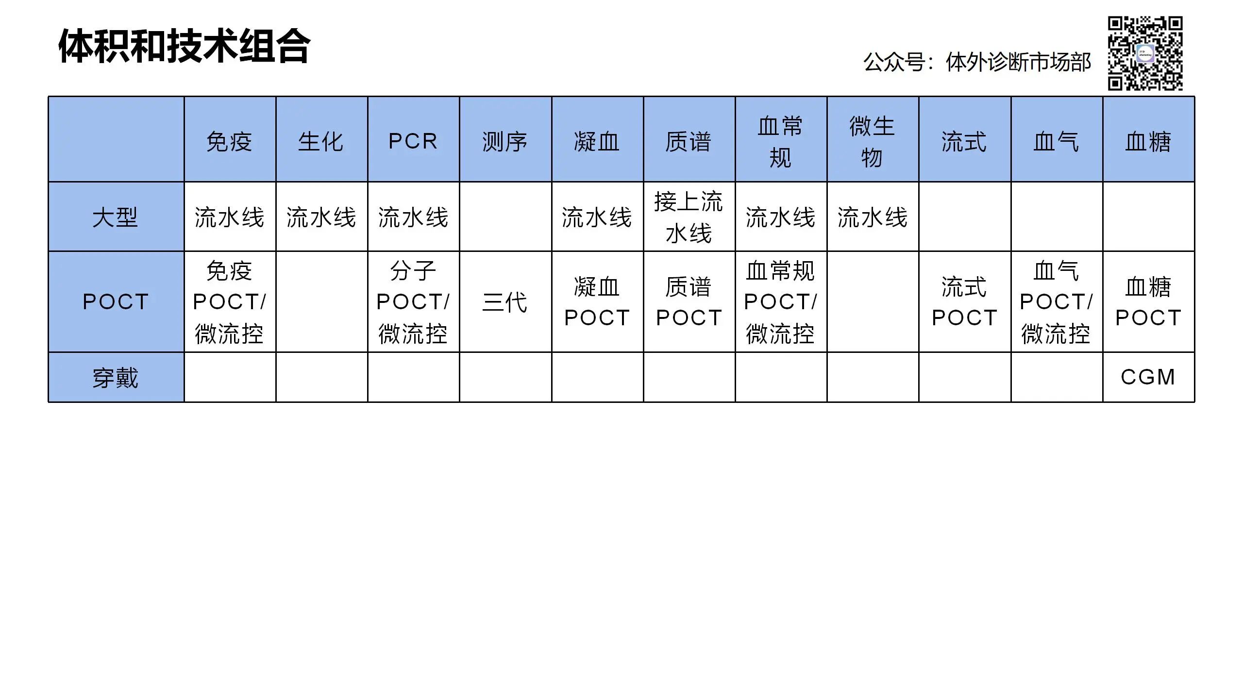 仔细看来上述都是选择了两个点进行融合,以排列组合的方式进行创新,如拆分来看单拿出来都有成熟的产品,但首次出现两个点融合的方式,仍然在当时价值很高。列举了能想到的一些组合维度供大家参考,才疏学浅未尽之处请大神们补充:举例:ICU和中心实验室TAT,会单独凑齐一批快速poct的仪器,但仍有一些套餐无法在自己实验室开全面,可以考虑整合到现有平台。ICU仪器很多,是否能够进行整合,是否需要进行整合。自从POCT概念出现,什么技术都能和POCT搭个边。尤其是微流控技术使得液路变耗材,仪器少了液路做的更小,甚至影响了实验室规划(如宠物检验室就几平米)。但是缩小归缩小,仍然很少IVD设备做成穿戴,三诺国产连续血糖监测设备是为数不多的案例。个人看来做不到穿戴,主要两点原因,一是国产IVD蛇形行业,脖子比较长,被掐住的比较多,很多件无法定制化也就缩不小;二是野蛮生长+医保控费+新冠透支,使得行业被迫催熟,没有几个公司有钱有人有时间,能沉住气做深入,导至创新力不足。也举个反例,POCT流水线可能是伪需求,POCT为了小流水线为了自动化,小而自动化为什么不是做一体机,而抛弃“小”的特点,去做POCT流水线。
