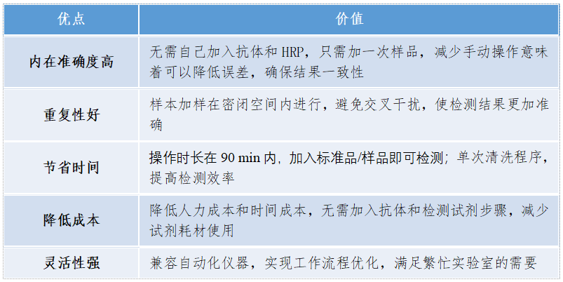 “ 今天,联科生物(MultiSciences)正式面向全球推出基于自主创新核心技术的一步法ELISA技术——EasyGo!TM一步法ELISA(简称“EasyGo!TM ELISA”),标志着中国民族企业真正掌握了ELISA金字塔顶端技术——一步法ELISA,打破了国际企业垄断,解决了“卡脖子”技术难题。同时,EasyGo!TM ELISA的诞生也将有力推动ELISA发展进入一个崭新的时代——从传统ELISA迈向一步法ELISA的2.0时代,助力生命科技和生物医药产业发展。 基于EasyGo!TMELISA技术,联科生物同步推出业界领先的一步法ELISA试剂盒——EasyGo!TM ELISA试剂盒。EasyGo!TMELISA试剂盒基于独创的微球专利技术,简化传统操作,获得准确度高、重复性好、灵活性强、省时省力的检测结果,较传统ELISA试剂盒具有明显优势,是广大用户特别是生物医药类企业用户和医疗机构的理想选择。 ” ELISA技术发展现状 酶联免疫吸附测定(enzyme linked immunosorbent assay,简写ELISA)是指将可溶性的抗原或抗体结合到聚苯乙烯等固相载体上,利用抗原抗体特异性结合进行免疫反应的定性和定量检测方法。 ELISA诞生于上世纪70 年代,数十年来凭借高灵敏度与高通量性一直稳坐蛋白定量分析的“ 头把交椅” ,是行业公认的“ 金标准” 。该技术以96 孔板的形式被许多生物试剂厂商开发成试剂盒。 传统ELISA技术包括直接法、间接法、双抗体夹心法和竞争法。其中双抗体夹心法是当前广泛使用的ELISA技术。该技术需要经过两步,甚至三步操作来达到孵育目的。随着需求不断变化,双抗体夹心法也不断更新迭代,从三步孵育法到两步孵育法,再到一步孵育法,最终优化为一步法。当前大多数ELISA试剂盒厂商仍然聚焦于传统的两步法ELISA,只有少数厂商研发出一步孵育法ELISA试剂盒。 一步法作为ELISA最先进技术,具有精准、稳定、省时、高效、灵活等众多优点,受到用户青睐。但是长期以来只有极少数国外公司掌握一步法和拥有相关试剂盒,且价格昂贵。对于国内用户特别是企业用户而言,只能望“洋”兴叹,“想用,用不起”! 然而,当前使用最广泛的两步法却仍然存在许多弊端和痛点亟需解决: 对广大科研用户而言,需要准备多组分试剂并稀释,操作过程繁琐复杂、耗时耗力;多次反复加试剂,导至实验出错或引起误差,重复性不好。 对企业用户如生物医药公司、CRO公司和CDMO公司而言,两步法检测耗时长、成本高、准确性低和稳定性差,导至实验失败风险加大和企业运营成本上升;并且操作繁琐复杂,无法满足大规模、工业化、自动化和流程化需求。 对医疗机构和医学检验机构而言,两步法耗时长、效率低、操作复杂,导至大量临床样本无法快速检测,临床诊治效率低下。 综上可知,传统ELISA技术的痛点和弊端长期以来一直困扰着广大用户。随着时代和科技发展,人们都对ELISA技术和ELISA试剂盒提出了更高的要求和期待。 EasyGo!TMELISA——引领ELISA技术2.0时代 联科生物紧盯ELISA技术痛点,洞悉用户需求,通过多年技术攻关开创了独有的HRP冻干微球技术,成为全球极少数、国内首个获得一步法专利并拥有一步法ELISA试剂盒的民族企业。 EasyGo!TMELISA通过将捕获抗体预先包被在酶标板底部,同时将检测抗体(或HRP)做成微球后预先放置在酶标板孔内,加入标准品和样本后即可显色检测,无需进行多组分试剂准备和稀释等繁杂操作,就能达到「样本进,结果出」、省时高效、出错率低、重复性好的效果。 EasyGo!TMELISA优化了传统ELISA技术弊端,解决了实验痛点,获得准确度高、重复性好的检测结果且省时省力,较传统ELISA方法具有明显优势和价值。 EasyGo!TMELISA与传统ELISA方法比较的优点与价值 EasyGo!TMELISA试剂盒——精准稳定、省时高效 EasyGo!TMELISA试剂盒基于联科生物开创的独有微球技术,预先包被捕获抗体与检测抗体-HRP,仅需加入标准品和样本,一步操作即可获得良好的检测结果。 EasyGo!TMELISA试剂盒与国内外品牌试剂盒性能比较(以Mouse TNF-α指标为例) 通过与国内外知名品牌试剂盒性能比较可知,EasyGo!TMELISA试剂盒的灵敏度、重复性比一步孵育法和普通两步法试剂盒更具有优势。不仅如此,EasyGo!TMELISA试剂盒操作灵活便捷、省时省力,非常适合大量样本、自动化、流程化、工业化应用场景。 EasyGo!TMELISA试剂盒精准稳定、省时高效的卓越性能解决了传统ELISA试剂盒的弊端和痛点,满足了广大用户、特别是企业用户对ELISA实验“准、稳、省、灵”的硬需求,为生物医药公司、CRO公司、CDMO公司等企业用户和医疗机构、医学检验机构等提供了理想的ELISA实验解决方案。 展望未来,联科生物将以此次推出EasyGo!TMELISA及试剂盒为战略契机,充分发挥自主创新技术优势和市场品牌优势,继续推动和引领ELISA技术创新发展。 彩 蛋 EasyGo!TMELISA试剂盒已正式同步上市销售,更多惊喜和活动敬请关注联科生物官方信息! EasyGo!™ELISA试剂盒首批上市15个指标 |