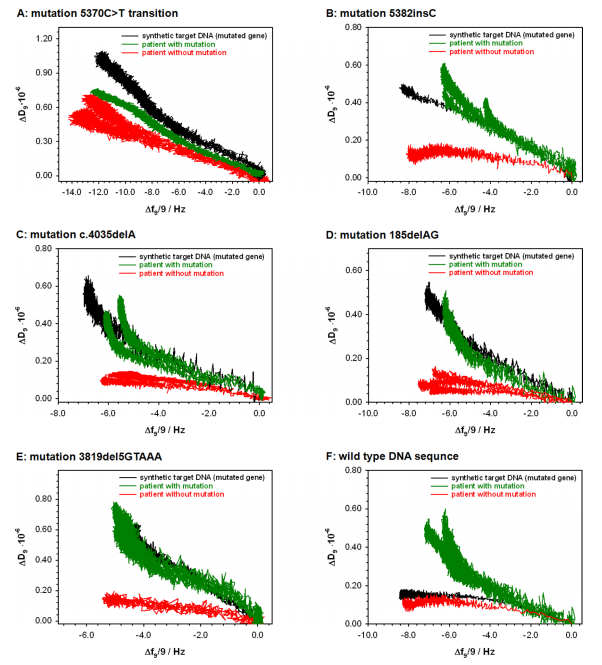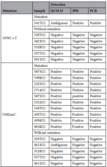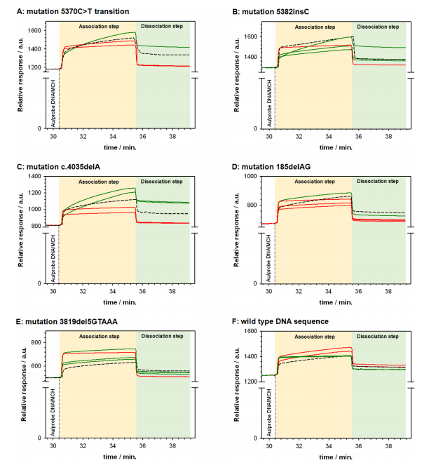 乳腺癌是世界各地女性最常见的恶性肿瘤之一,也是女性死亡的主要原因之一。约5-10%的女性乳腺癌症病例与遗传易感性有关。与乳腺癌症高风险相关的两个关键因素是BRCA1和BRCA2基因的突变。这些遗传变异主要包括小的移码突变、无义突变、剪接位点突变和缺失。还发现了插入、错义突变和过早转录终止。由于全世界乳腺癌和卵巢癌的高死亡率和发病率,快速有效地检测BRCA1基因突变变体对预测癌症风险具有重要意义。然而,BRCA1基因的巨大规模和突变的多样性使这种分析变得复杂和具有挑战性。 BRCA1基因突变诊断的金标准是直接序列分析。然而,这种方法既耗时又昂贵。其他更快、更便宜的替代策略依赖于扫描技术来识别包含遗传序列变化的BRCA1基因片段,但不提供突变类型的信息。最常用的扫描技术有:单链构象多态性(SSCP)、构象敏感凝胶电泳(CSGE)、基于荧光的构象敏感凝胶凝胶电泳(F-CSGE),蛋白质截短试验(PTT),高分辨率熔融分析(HRM)和变性高效液相色谱(DHPLC)。这些技术足够灵敏,可以检测低水平的突变,但都不能用于检测大的重排,如整个外显子的缺失。 近日,一组来自波兰的研究团队在杂志Scientific reports上发表了一篇题为“New, fast and cheap prediction tests for BRCA1 gene mutations identifcation in clinical samples”的文章。这项工作开发了使用表面等离子体共振(SPR)或耗散型石英晶体微天平(QCM-D)检测,基于DNA杂交来简单、快速地识别BRCA1突变。作者在合成寡核苷酸和从患者身上采集的真实样本上共同进行了研究。这些技术不需要任何报告基因的存在,这大大简化了检测过程。这可能是目前使用的分子诊断方法的一个极好的替代方案。 图片来源:Scientific reports 主要内容 SPR分析 表面等离子体共振是一种光学效应,可用于实时研究分子的键合,无需标记。使用这项技术,可以获得物质的量以及所形成复合物的特异性和选择性的信息。在这项工作中,对有BRCA1突变和没有BRCA1突变的样本进行了SPR测量。由此产生的传感图如下图所示。 传感图包含缔合和解离过程。在缔合阶段,分析样品中的DNA片段与固定在金芯片表面上的探针DNA进行杂交,SPR信号增加。这个过程的有效性取决于靶DNA和探针DNA之间相互作用的强度(它们的互补程度)。用缓冲液代替分析物溶液会导至解离阶段,在这个过程中形成的复合物会解离。SPR信号的强度随后开始降低。只有当存在完全互补的DNA序列时,才观察到SPR信号的显著指数增加(图F)。即使与靶DNA部分缺乏互补性,即使在点突变的情况下,也会导至曲线性质的剧烈变化——SPR信号的增加要小得多,也要慢得多。从SPR实验中确定的动力学参数可知,当DNA分析物与探针DNA序列完全互补时,DNA双链形成的结合速率常数比非完全互补的DNA片段高103–104倍。 在与靶DNA序列的杂交过程中记录的SPR传感图。 图片来源:Scientific reports QCM-D分析 另一种允许在不标记的情况下实时控制分子之间相互作用的技术是耗散型石英晶体微天平(QCM-D)检测。这种技术与SPR一样,可以获得所形成复合物的特异性的信息。当分析物未被精确定义时(临床样本的情况下),QCM-D检测对目标DNA的识别可基于ΔD = f(Δf)关系,DNA片段相互匹配的程度可通过ΔD = f(Δf)很好地说明,如下图所示。其中斜率的变化表明在石英晶体表面上形成的层的规则性和堆积密度的变化。只有当分析的样品含有与探针DNA片段完全互补的片段时,这些变化的性质才与合成互补DNA链所获得的变化相同。在分析的溶液中存在非完全互补的DNA片段时,该关系的斜率显著低于参考曲线。 杂交过程中的QCM-D检测数据图。 图片来源:Scientific reports 原子力显微镜(AFM)分析 基于AFM图像来分析沉积在金表面上的膜的形态。样本图像如下图所示。在用巯基化探针DNA进行初始修饰后(见图A),不规则形状的沉积岛出现在金表面上。这些图像是由化学吸附的探针DNA分子形成的,在这些条件下,探针DNA分子很可能呈现随机/卷曲构象。当存在与探针DNA完全互补的合成靶DNA的样品时,2小时后观察到了明确的变化(见图C)。杂交可以迫使随机取向的探针DNA链展开并促进碱基配对,从而使分子的构象从随机卷曲变为部分或完全拉伸。如图D–G所示,在有位点突变的情况下,薄膜表面也可以看到拉伸的DNA链片段,但出现频率低于靶DNA,并且观察到的片段通常更短。AFM图像的上述分析仅提供了定性比较。然而,它清楚地显示了表面膜的形态上的显著差异,这取决于互补程度和将单个样品与探针DNA杂交的能力。 不同靶DNA的AFM图像形态。 图片来源:Scientific reports 临床样本BRCA1基因突变的鉴定 研究团队使用了从患者身上收集的22个不同的临床样本:17个样本来自不同BRCA1基因突变变体的患者和5个没有任何BRCA1突变的患者样本。使用BRCA1突变基因序列作为探针DNA进行实验。从下表中可以看出,SPR和QCM检测的基因测试可完美地确认或排除分析样本中特定突变的存在。目前的研究可根据两种测量方法(QCM-D、SPR)来区分存在缺失和插入的样本。对于QCM-D和SPR测试,其特异性分别为80%和100%(4/5和5/5),选择性分别为94.1%和100%(16/17和17/17)。 临床样本BRCA1基因突变的鉴定。 图片来源:Scientific reports 总结和讨论 快速做出治疗决定需要能够快速明确地获得可靠结果的程序。这种理想的基因测试,其特征首先应该是其结果的可靠性、简单性、实施时间短、成本低,并且只使用少量