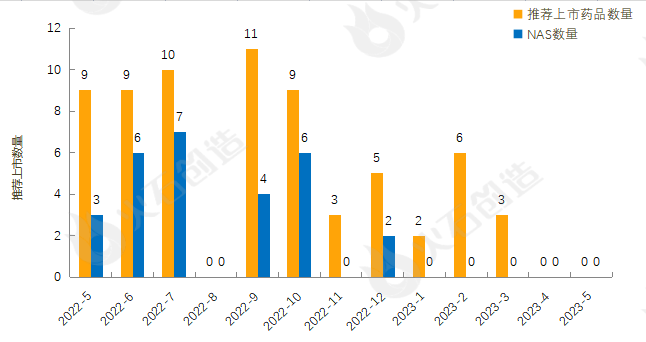 截至2023年6月8日EMA官网披露,2022年5月至2023年5月的推荐上市药品及新活性物质(NAS)数量情况见图2,2023年5月EMA未推荐药品上市。