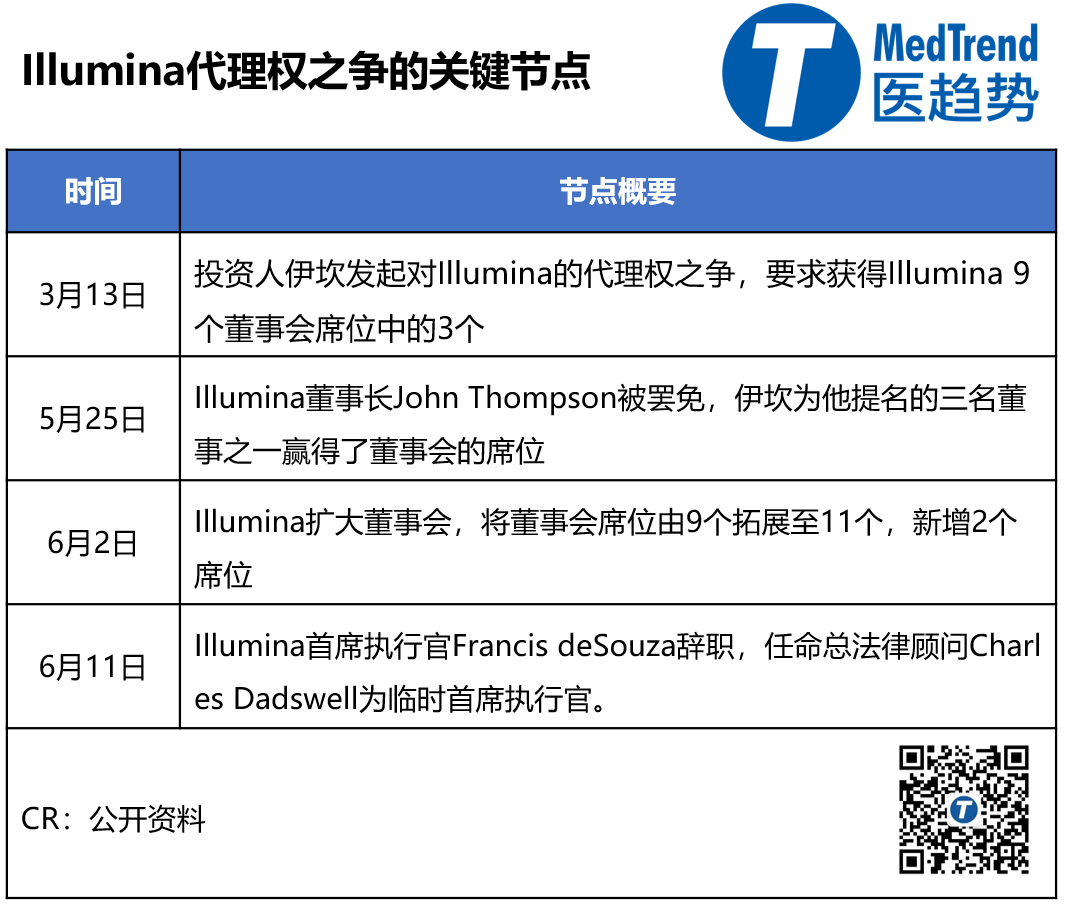 投资人与企业高管的关系复杂而多样,常常演绎出各种“爱恨情仇”故事。而冲突的本质,往往是与权利、利益、目标等相关博弈。 全球基因测序巨头Illumina(因美纳)的代理权之争,始于亿万富翁投资人伊坎(Carl Icahn)。他持有Illumina公司1.4%的股份,对Illumina的现状强烈不满,尤其是他认为收购Grail所付出的代价太大。剥离又回购Grail,在被反垄断机构盯上的近三年里,Illumina市值损失近500亿美元。 伊坎的解决方式直接指向“重组管理层”。在与Illumina进行了数周的私下讨论,但“未能取得进展”之后,今年3月,伊坎通过致其他投资人的公开信,正式打响这场由关于Illumina代理权的龙争虎斗。 到6月初,经过两个多月的公开拉锯,这场资本与企业高管的“战争”趋于尾声:继上月底Illumina股东罢免董事长John Thompson之后,6月11日,Illumina宣布其首席执行官Francis deSouza已经辞去了他的职位和董事会席位。 013个月,投资人“踢掉”董事长、CEO 十年之前,加入Illumina担任公司总裁的Francis deSouza,绝对没有想到十年后的他面临着进退维谷的窘境。 那时候的他,还是意气风发。在担任Illumina总裁职位三年后,deSouza接棒Illumina首席执行官职位。 当时Illumina是一家快速增长的公司,牢牢控制着DNA测序市场。在deSouza的领导下,Illumina进一步将业务范围从研究实验室扩展到医院和诊所,并向市场推出了新的测序工具,降低了DNA分析的成本。 到2023年,担任CEO七年的deSouza,赶上的不是“七年之痒”,而是激进投资人伊坎发起的代理权运动。 激进投资人,也称作维权投资人,通常是指一些对冲基金、机构的投资人,为了捍卫自身权益,要求公司作出改变甚至插手企业决策,如提高派息、回购股票、削减成本、调整管理层,有时甚至是分拆重组公司。 伊坎这位87岁的亿万富翁仍然是业内最令人恐惧的激进投资者之一。漫威娱乐、网飞、美国钢铁公司、戴尔科技和苹果等公司的董事会都感受过他的威力。 2023年初,伊坎的目光对准了Illumina。 这一年,深陷于并购反垄断审查“泥沼”的Illumina的市值已经从约700亿美元缩减至300亿美元,而于2020年9月发起的对肿瘤早筛技术公司Grail的收购,交易至今未能了结。 ▲Illumina上市以来的股价波动(截至2023年6月12日) 董事长出局 3月13日,伊坎在一封信中告诉其他投资者,他计划提名三名董事候选人进入Illumina九人董事会。并明确表示,此前他与Illumina公司进行了数周的私下讨论,但“未能取得进展”。 伊坎的“代理权运动”主要基于三个关键论点: ① 回购Grail不尽人意。伊坎认为,面对美国和欧洲监管机构的反对,Illumina在近三年的时间里努力回购癌症血液检测开发商Grail,耗尽了自己的资源。 ② Illumina股价大幅缩水,市值损失高达500亿美元。 ③ CEO过高的薪酬。2022年,deSouza的总薪酬+86%至2670万美元,近乎翻番,其中大部分是通过股票期权获得的。而Illumina的股价在过去两年里下跌了大约一半。 伊坎表示,希望获得董事会席位,是因为担心Illumina的现任董事们会“一直追求并购Grail,而不考虑他们留下的价值破坏程度”。不顾欧洲监管机构的反对,完成交易的决定“带来了惊人的风险”;而新的董事会人选,将帮助Illumina避免“进一步下沉”。 或许是Illumina的投资人确实“苦Grail的收购久矣”,伊坎的公开信发布的当天,Illumina股价大涨17%,从194.01美元/股上涨至226.96美元/股。 要将三人纳入董事会,就需要将原有的成员踢出局。 伊坎瞄准的是Illumina董事长John Thompson、CEO兼董事会成员deSouza、以及董事会成员Robert Epstein。 在伊坎的敦促下,5月25日,Illumina股东发起投票。 伊坎在股东中取得了部分胜利: