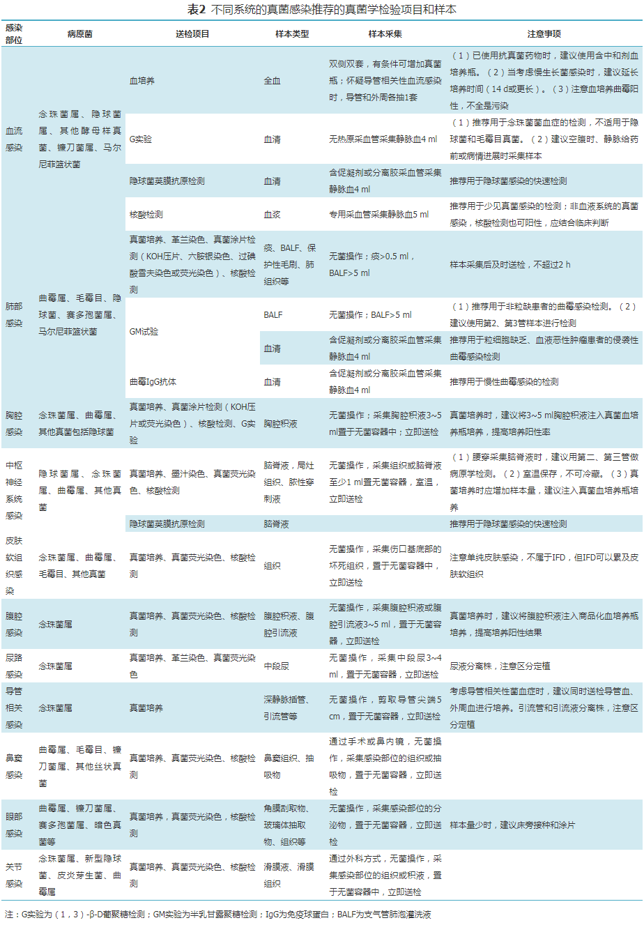 血清G实验阳性主要用于疑似IFD(包括念珠菌病、曲霉病、肺孢子菌病等)的辅助诊断,但不适用于隐球菌病和毛霉病;G实验NPV较高[84]。动态连续监测可用于指导念珠菌感染的抗真菌治疗[85](弱,中)。对G实验,输注白蛋白或球蛋白、血液透析患者、输注抗肿瘤的多糖类药物、使用磺胺类药物、外科手术后及样本接触某些纱布等可能造成假阳性;采血管污染可能出现假阳性;严重溶血样本可能造成假阳性[86]。近平滑念珠菌病时有一定假阴性率;抗真菌药物的使用可能造成假阴性。