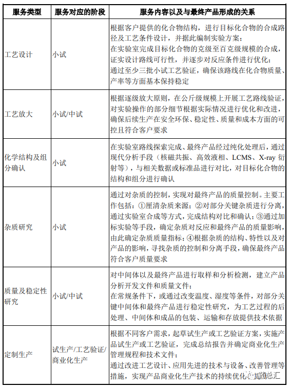 CDMO企业与CMO、CRO企业在药品设计与研发方面的差异: 近年来,全球医药行业的竞争日趋激烈,制药产业链中的分工日益细化,医药行业的专业化外包已成为制药企业的重要战略选择。随着医药外包服务机构专业化程度的不断提高, 医药外包服务的内容逐渐涵盖了从疾病目标研究、药物化合物筛选、临床试验服务、工艺研发、规模化生产直至市场销售的各环节。根据所提供服务的内容划分, 医药外包服务机构主要包括 CRO、CMO、CDMO 企业等。 CRO 企业(合同定制研发机构)是指通过合同形式为制药企业和研发机构在药物研发过程中提供专业化服务的机构。CRO 企业服务于药物研发的整个阶段,负责药物开发过程所涉及的全部或部分活动,其基本目的在于协助制药企业进行科学或医学研究,主要提供的服务包括新药发现、安全性评价研究服务、药代动力学、药理毒理学等临床前研究及临床数据管理、新药注册申请等。 与 CRO 企业不同, CMO/CDMO 企业主要侧重于药物的生产服务。其中,CMO(合同定制生产机构)是指以合同定制形式为制药企业提供中间体、原料药、制剂的生产以及包装等服务的企业。传统的 CMO 企业仅提供以委托企业提供的技术路线为基础的代工生产服务。随着制药公司对成本控制和效率提升的要求不断提高,制药企业希望 CMO 企业能够承担更多工艺研发、改进的创新性服务职能, CDMO 企业应运而生。 CDMO 企业(合同定制研发生产机构)除了提供传统 CMO 的生产服务之外,更强调对生产工艺的研发和创新。CDMO 企业往往在新药临床阶段的早期即与客户开展深度合作,为客户提供制药工艺的开发、设计及优化服务,并在此基础上提供从公斤级到吨级的定制生产服务。CDMO 企业利用自身技术优势及生产能力,承接了制药企业的工艺开发和生产职能,从而使制药企业可以更专注于药物的研发。 CDMO 企业与 CMO、 CRO 企业在药品设计与研发方面的差异总结如下: CDMO 企业在设计与研发领域的比较情况: CDMO 业务在工艺开发、工艺优化等设计、研发方面的流程: CDMO 服务与销售产品之间的关系: 销售商品是公司 CDMO 服务成果的最终交付形态。药物研发是一项高风险、 高投入、长周期的系统性工程。制药企业客户为了降低药品研发成本,提高生产效率,将制药工艺研发和生产委托于公司定制开展。公司接受跨国制药企业委托为其提供的制药工艺研发和药物生产的服务过程即为 CDMO 服务。公司服务内容一般包括工艺设计、工艺放大、化学结构或组分确认、质量及稳定性研究、杂质研究、定制生产等多种研发和生产内容。工艺开发和生产过程完成后,公司将最终服务形成的中间体或原料药等商品交付给客户完成全部服务过程。具体而言, 发行人提供的 CDMO 服务与销售产品之间关系如下: 第一、CDMO 服务是最终商品形成的业务过程。公司为客户提供的 CDMO 服务的主要目标是按照客户要求成功研发出具备商业化生产可行性的医药中间体或原料药等产品。CDMO 服务是最终产品得以形成的过程。公司提供的各项 服务内容及其与最终产品形成的关系如下: 第二、CDMO 服务是满足客户定制需求的必要条件。不同于大多数通用产品取得订单便可以组织实施生产,医药定制产品是专业性程度较强、定制化程度较高的特殊产品。公司在开展定制研发和定制生产过程中,必须时刻知悉定制客 户的特定需求,通过反复多次的技术交流,确定产品的各项技术细节。公司 CDMO 服务过程正是公司按照客户定制化需求提供工艺开发等各类服务的过程。为了满足不同客户在药品生命周期不同阶段的定制化需求,公司需要提供个性化的定制研发生产服务。公司根据定制客户的要求,基于对工艺技术的深刻理解, 研发并确定适合的合成路径及条件,并通过对关键工艺参数有针对性的调整,实现对目标化合物关键属性的精准控制,以满足客户对定制产品的要求。因此,制药企业客户期望通过委托合作取得的定制化商品,只有通过 CDMO 的详细服务过程,才能得以实现,CDMO 服务过程是定制化商品形成的必要条件。 第三、终端客户通过质量审计等合作程序参与公司提供的 CDMO 服务。由于医药行业的特殊性,医药行业的定制研发生产与普通合同委托有较大的差别。终端客户将药物研发生产环节委托给公司定制开展,对药品及其中间体的安全、 有效和质量都极其关注,仅依据最终交付的商品无法对药品生产过程进行全面有 效判断。因此,在日常 CDMO 合作中,制药企业客户往往会通过合格供应商资格认定、定期或不定期质量审计等形式,参与公司 CDMO 服务过程,将药品注册有关安全、有效和质量可控的要求,贯彻到定制研发和生产的全过程中。因此, CDMO 服务过程是制药企业客户确保公司最终交付的医药中间体或原料药产品 在各个方面符合其质量要求的关键途径。 第四、公司 CDMO 服务内容及成果交付形态与同行业可比上市公司的 CDMO 服务内容及成果交付形态基本一致。具体比较如下: 综上所述,销售商品是公司 CDMO 服务成果的最终交付形态,CDMO 服务 是最终商品形成的业务过程。CDMO 服务过程是最终产品形成的必经之路,这主要体现在以下两个方面:一方面,公司向客户交付的产品均为定制化的产品, 制药企业定制化的研发生产需求只有通过 CDMO 的详细服务过程才能得以满足;另一方面,CDMO 服务过程是制药企业