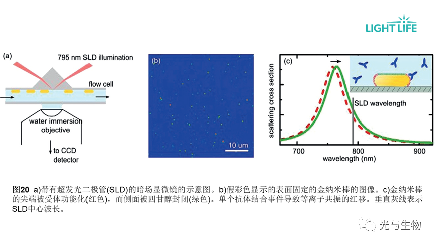 束缚粒子监测可以用于在免疫测定中监测单分子结合事件。7.无标记检测 等离子体纳米结构的排列对分析物结合非常敏感。局部表面等离子体共振(LSPR)可用于追踪等离子体纳米颗粒附近局部折射率的变化,从而与分析物的存在联系起来。例如,使用金纳米棒检测生物素和抗生物素抗体的相互作用(图20)。