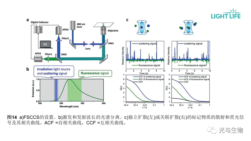 与分析物结合的带有荧光标记的抗体具有较低的电泳迁移率,在毛细管电泳中可与游离抗体区分开,通过宽视野显微镜记录。例如Erenna平台检测心肌肌钙蛋白(LOD达0.2-1.7 pg/ml)、可溶性Ab低聚物(LOD达1.56 pg/ml)、突变型亨廷顿蛋白mHTT(LOD达40 fm)、人促性腺激素卵泡刺激素(LOD达34 fm)。 - 荧光交叉相关光谱(FCCS)使用两种光谱不同的荧光探针,通过不同的激发波长同时激发,并在两个不同的通道中检测,计算互相关曲线的振幅,以测量荧光探针与分析物的相互作用(图9)。可提高定量测定的灵敏度。