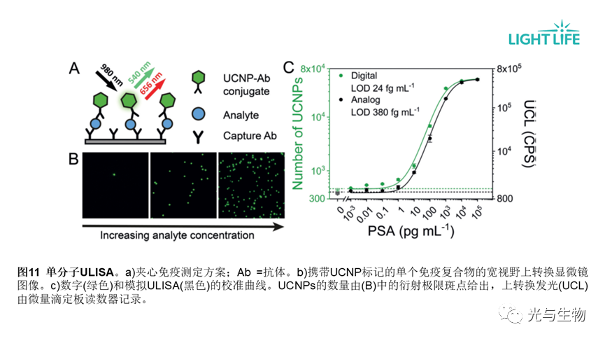 5.纳米颗粒标记 近年来,具有发光或等离子体性质的纳米颗粒被作为免疫分析的标记。与分子标记相比显示出更高的信号、更易进行光学读出,但缺点是尺寸较大,可能导至更大的空间位阻以及更高程度的非特异性结合。量子点(QDs)是尺寸通常在1和10 nm之间的荧光半导体纳米晶体。量子点的发光特性可以通过改变纳米晶体的尺寸来调节,从而能在380至2000 nm的范围内调节发射波长。与传统荧光团相比具有更高的发射强度、更好的光稳定性、更宽的激发光谱和更窄的发射带宽。Liu等人开发了基于QD标记的夹心免疫测定法,使CEA和AFP的LOD分别达到了6.7 fm和3.4 fm。光子上转换纳米颗粒(UCNPs)可在近红外(NIR)激发下发射较短波长光(反斯托克斯发射),大大减少了自发荧光和光散射。UCNPs的其他优点包括光稳定性高和多个窄的发射带,可用于多种分析物的并行多重检测。已开发一种通过传统的表面发光显微术可视化单个UCNP的方法,应用于PSA的灵敏检测(图11),LOD达到1.2 pg/ml,并覆盖了三个数量级的动态范围。基于聚乙二醇包被的UCNPs与链霉亲和素复合物的检测标记进一步将LOD降低至20 fg/mL。如果样品可自发强荧光,由于光谱重叠,亚纳摩尔浓度的标记的FCS/FCCS信号将不可检测。但可以通过使用更亮的标记或者通过测量UCNP标记的互相关,以避免光学背景干扰。等离子体纳米颗粒能够基于其光散射特性和分析物结合时的光谱变化进行高灵敏度的检测。最常见的材料包括金(Au NPs)和银(Ag NPs)。银纳米颗粒更容易被氧化因而不太稳定,但具有更高的消光系数和更强的拉曼和荧光增强。- 一种基于抗体的单粒子散射强度分析,用于检测各种临床癌症标志物,如AFP、CEA和PSA,LOD达到1至6 pm。