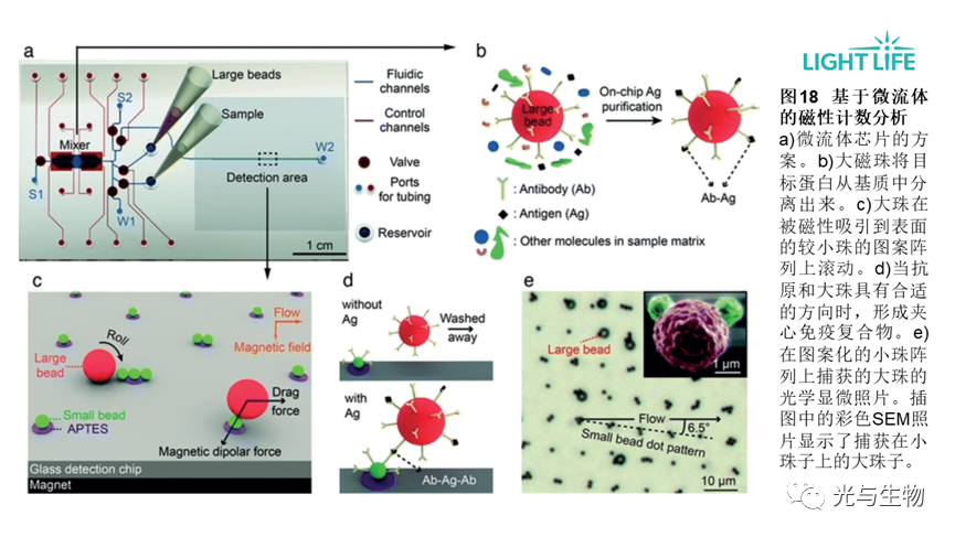 6.2 明视野显微术 - 开发了一种基于微流体的磁珠计数法,用于检测血清中的蛋白质(图18)。将磁性预浓缩步骤与微流控芯片中结合的磁珠的数字计数相结合,用于检测TNF-α,LOD达到1 fg/ml。