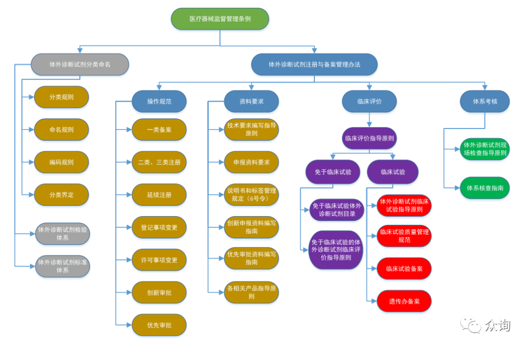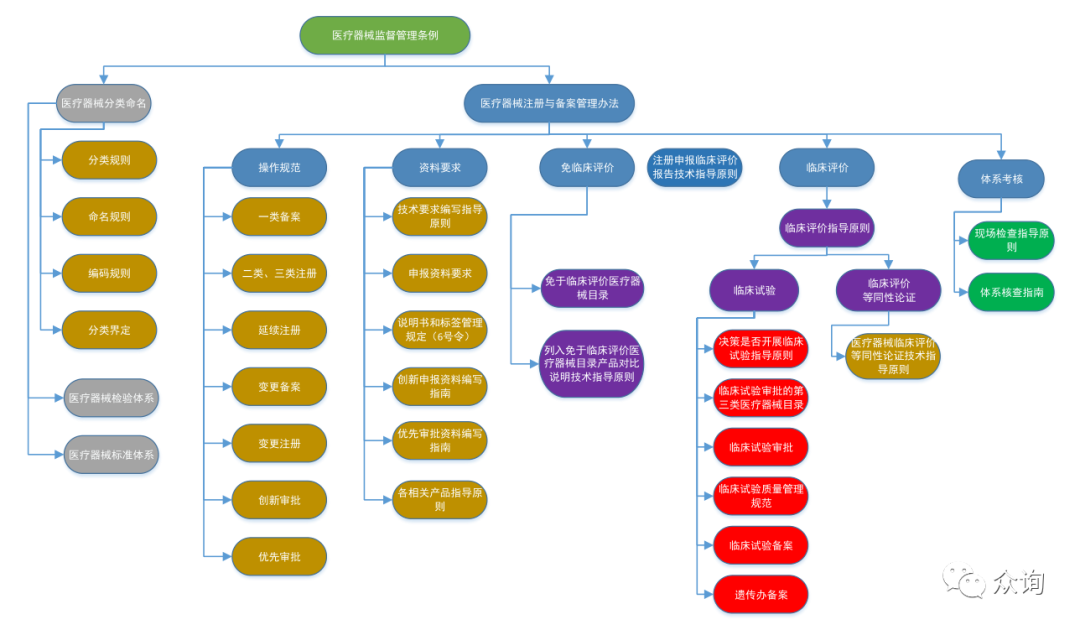 为了方便使用,我们整理了这份流程图,罗列了境内外第二类/第三类医疗器械首次注册、延续注册、变更事项流程,以及创新、优先、应急审批等流程,便于更快速了解医疗器械的监管要求。 1、法规监管结构 2、法规要求框架 Ø医疗器械法规框架