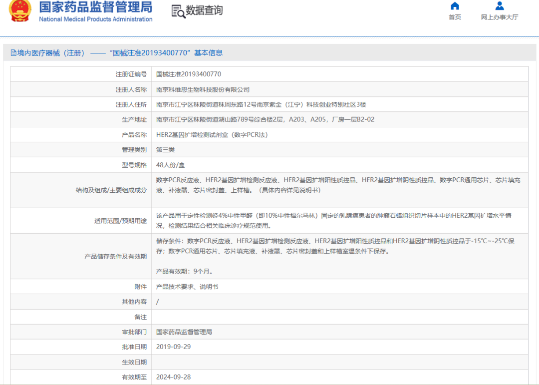 数字PCR在国内已发展了10余年,国产数字PCR也是并驾齐驱。数字PCR技术,因其具有高灵敏度、绝对定量、高稳定性和较高的抗干扰能力已经被体外诊断行业、科研领域、环境监测、食品安全和生物制药等广泛认可。 然而,分子诊断技术应用到临床的关键点是,该技术是否获得临床认可的III类医疗器械注册证,数字PCR作为新兴技术已经广泛应用于科研、环境监测、食品安全和生物制药等领域,在临床医疗领域尚未广泛使用,其主要原因是数字PCR技术尚未获得较多的III类医疗器械注册证。 NMPA官网查询到,截至2023年6月21日之前,只有南京科维思生物科技股份有限公司 Her2基因扩增检测试剂盒(数字PCR法)获得III类医疗器械注册证。