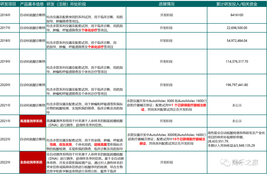 节选自简乐之旅 01 头部企业做分子诊断怎么玩? 最近,圆乐手里有一个分子诊断项目,加上有些个人的其他需要,所以关注到安图生物在分子诊断方面的一系列动作。 圆乐个人愚见:这也算是“知耻后勇”的一个例子吧? 2023年6月16日安图生物公众号发布了一则新闻——上海市实验医学研究院生物信息研究所成立。 圆乐第一时间关注到了,本来想写一篇文章的,由于其他事情耽误,加上对原计划的切入点,失去写成文章的兴趣,所以就作罢了。 今天正好拿出来当例子说说。 据报道生信所是依托于上海市实验医学研究院,由安图生物牵头成立,研究重点围绕肿瘤诊断、传感染防控、生殖遗传等三个重要的临床应用方向。 正如安图生物的苗总说的:“安图生物多年前已布局NGS产品线业务,建立了郑州、上海双研发中心,以“基因+大数据”技术融合为抓手,扎实推进生物信息技术在临床应用的研究,并且已取得了积极的研发成果。” 圆乐从安图生物历年年报的主要研发项目的对比中发现,从2021年开始才首次出现高通量测序系统项目,2022年的进展情况是“开发阶段”。 除了自行开发以外,在2023年4月份,安图生物用数千万元独家投资了深圳市梅丽纳米孔科技有限公司,该公司从事第三代基因测序技术的研究并开发了纳米孔测序仪。 另外2023年5月31日下午,首都医科大学附属北京胸科医院与郑州安图生物工程股份有限公司结核课题科研合作协议签约仪式圆满举办。 安图生物在今年第二季度频繁报出新闻,相信也让很多同行羡慕吧。 前两天和一个分子诊断公司的人聊天,圆乐开玩笑地说,当大公司也在本来就竞争得热火朝天的分子诊断领域使劲砸钱的时候,留给很多纯做分子诊断的小公司的机会就更少了。 小企业是自己找几个人搞搞搞,而大公司的玩法是技术端国内、国外建立多研发中心搞事的同时,看到中意的同行就买买买,在客户端投投投,合作合作合作。 02 从自罚三杯到发展元年 前文为什么说安图生物在分子诊断领域属于知耻后勇呢? 记得2020年疫情刚开始的时候,各IVD公司都拼命做新冠检测的试剂盒,安图生物当时其实也做出来了,很多人连续通宵加班的辛苦令人心疼。 可是,结局并不好,不仅国内产品注册证没有第一时间拿到,而且在国外也出现了情况。 2020年4月24日,安图生物的新冠产品获美国FDA紧急使用授权 ,是国内首个获得该授权的新冠病毒抗体检测产品。 然而2020年8月6日,FDA取消了安图生物新冠抗体试剂的紧急使用授权。 当不少公司在核酸检测中赚得盆满钵满的时候,安图生物同样默默无闻。 虽然后来也陆续拿到注册证,但是已经错失了最好时机。 安图生物的领导团队为此“自罚三杯”——高管降薪20%。 可是,也就是2021年自罚三杯后,分子诊断迎来真正的发展元年。 首先是分子诊断试剂首次出现在产销表中,且发展迅速。 最让同行内震惊的是他们在仪器上扔了一个炸(AutoMolec 3000 和AutoMolec 1600获医疗器械注册证),虽然称不上王炸,但着实让人刮目相看。 有一次和星哥聊天的时候,他说本来他公众号转发这个新闻的时候是放在公众号第5条,很靠后没想到短短时间内阅读量已经过了15000,很快成为不少同行议论的话题。 参考:AutoMolec 3000:凸显安图生物在分子诊断方向野心为此星哥还专门去跟博德致远创始人杨总请教,杨总表示: “你是不知道安图这个产品获证新闻对于分子诊断同行带来的震撼! 所有分子诊断产品都在研发这个产品,包括宏石,雅睿,天隆,圣湘,之江,但是居然是一个化学发光企业先拿证,你让他们找谁说理去? 还有根据推测,安图这个产品应该是2015,2016年左右立项的,这两年不正好是安图和新产业在化学发光市场厮杀的最厉害的时候吗?人家安图还腾出手来整了这么一出。这样的同行谁不害怕?” 2021年,上海研发中心、美国研发中心正式运营,与普施康生物在POCT检测领域开展战略合作。 同时,分子诊断项目菜单涵盖8 大系列 60 余个项,获 16 项注册(备案)证书,并取得了 7 项产品的欧盟CE 认证 。 由此可见,一时没有把握机会虽然可惜,但并不是重点,重点是能否从哪里摔倒哪里爬起来,并真正把事情做成、搞好。 03 是自己搞,还是从外面买一个好? 当然,事情绝对不是说态度上转变了,结果就能好的。 很多事情,态度虽然很关键,但是在技术上能力积累更关键。 圆乐之前研究过安图生物的年报,关注他们的研发项目,并对他们分子方面的变化进行了简单的整理。 从年报数据来看,分子诊断方面是安图生物重要的发展战略之一,从2016年报累积投入841万,到2020年报累积投入将近2个亿,他们用真金白银说话。 虽然从2021年往后没有公示具体研发项目的投入费用,但是我们从分子诊断研发费用占总研发费用的占比可以有一些了解(根据年报整理)。 不算2016年之前,不考虑新冠的推动作用。 从2016年开始,到2021年拿到仪器注册证,安图在分子诊断方面用了6年+时间,投入超过2个亿的资金,自己干。 值得吗? 这是一个见仁见智的问题! 有一篇文章的作者曾经如是评价安图的仪器,忘了哪里看到的了,不过圆乐存了评价内容:“3000和1600从仪器的结构上,太过于复杂,体积也大,仪器的成本和维护成本会比较高,很难大规模的下沉到基层市场。” 当然,作者后来通过市场的成果对自己现前的想法进行了反思,不过他说的也是一部分现实。 当然这里的重点不是值不值的问题,过