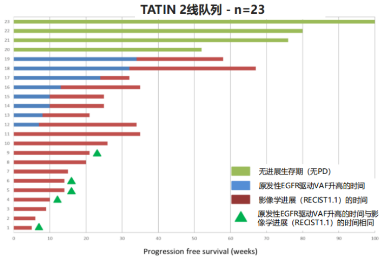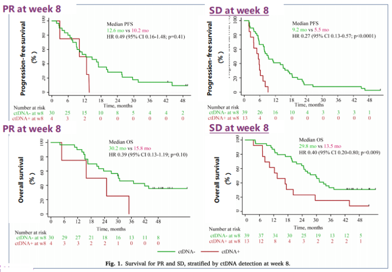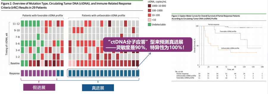 该研究证明,靶向治疗第8周经MRE评估EGFR清除的患者具有更长的PFS及OS。 另外,一项奥希替尼治疗72例EGFR T790M阳性IIIB-IV期NSCLC患者4,显示靶向治疗第6周MRE清除的患者具有更长的PFS及OS。 图注:在奥希替尼治疗第6周ctDNA清除与更好的PFS (12.5 vs. 5.8 months, P=0.022) 和OS (NR vs. 13.1 months, P=0.009) 有关。 进一步患者精细化分层: 另外,MRE也可在免疫治疗第6周筛选出OS更长的SD患者。 图注:C:C3D1的ctDNA 水平在LOD检测限以下的患者OS更长 (<1 MTM/mL, ctDNA 低风险)(精确P值为0.00029871)。D、E:治疗第6周的SD及PR患者通过C3D1进一步分层,ctDNA低风险患者OS更长。 而且在靶向治疗中,有研究提示MRE与RECIST结合可以更精准评估EGFR突变型NSCLC(尤其是SD患者)的治疗疗效6。 图注:靶向+化疗治疗8周时,与未清除相比,ctDNA清除的SD患者mPFS (16mon vs 10mon)和mOS(NR vs 10mon)延长。 29个PD黑色素瘤患者(20个真PD+9个假进展)进行ctDNA动态监测(从基线到治疗12周)7,显示MRE也可以进一步区分哪些患者是“真进展”,哪些患者是“假进展”,“ctDNA分子应答”型来预测真进展的灵敏度是90%,特异性为100%! 早期提示进展风险: MSKCC临床试验中的NSCLC患者(n=363)8,约20% PFS≥12个月,其中31位患者进行血浆监测,中位监测时间为26.7个月。研究表明,MRE阳性的免疫治疗获益患者具有进展风险,4例患者ctDNA阳性并全部进展,27例ctDNA阴性患者中25例未进展,ctDNA阴性患者的中位EFS显著长于阳性者。 同样在靶向治疗中,研究提示MRE变化早于影像学,可通过MRE升高的靶向治疗患者具有进展风险9。 在TATIN 2线队列(n=23)10,19例PD患者中有13例(68%)在影像学PD前或同时检测到原发性EGFR驱动基因升高: