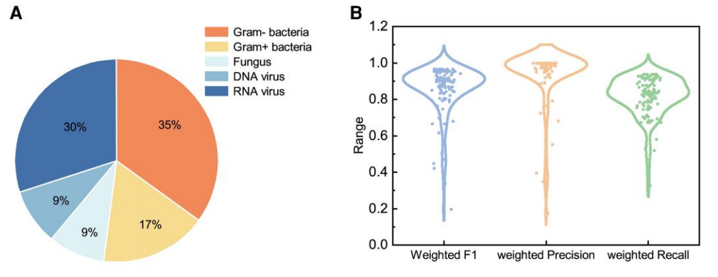经过作者分析,浓度≥104拷贝/毫升产生假阴性的主要原因是湿实验室流程导至微生物序列丢失。对于RNA病毒,湿法实验室期间微生物序列的丢失也是导至RNA病毒假阴性结果的最常见原因,近85%的假阴性结果在生物信息学分析前留下不超过3个reads(图C)。真菌和细菌的假阴性结果都倾向于在数据预处理和去除人类序列的过程中丢失微生物序列(图D)。