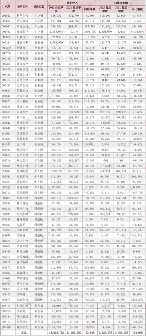 2022年前三季度体外诊断行业A股上市公司数据(单位:万元)