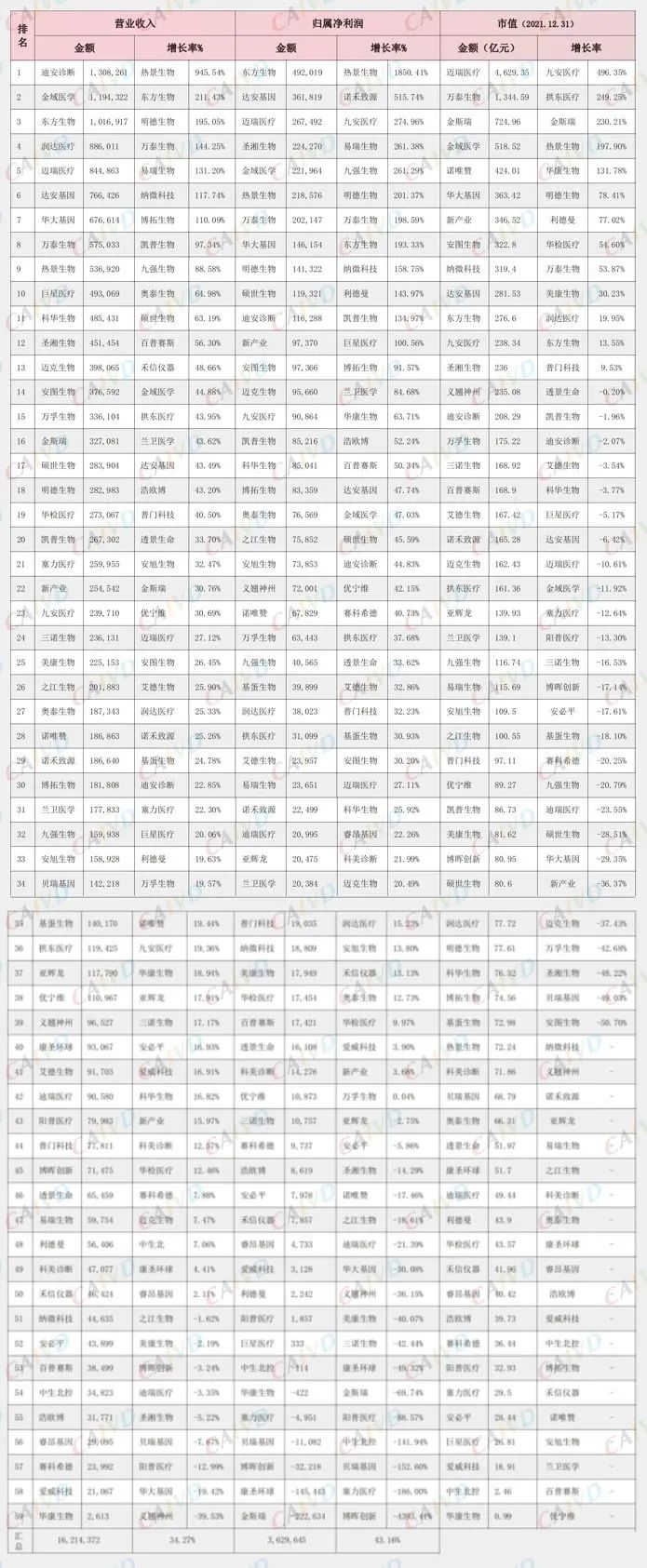 2021年诊断上市公司关键数据排行(万元)