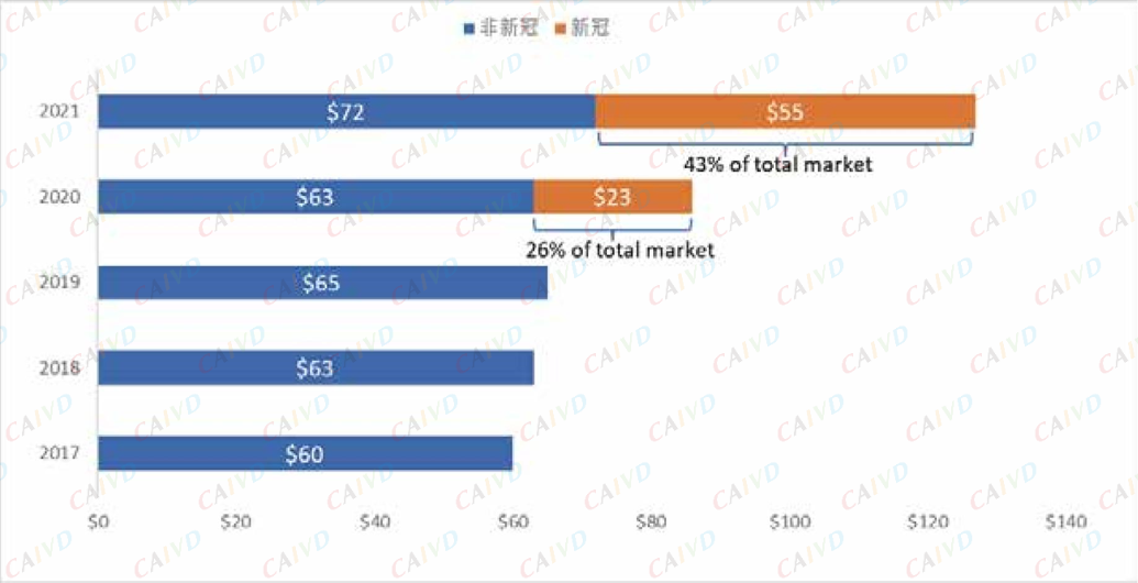 根据美国IQVIA披露数据,过去两年内全球IVD市场的年复合增长率达到两位数,2021年全球IVD市场规模为1270亿美元(其中新冠占比43%),2020年全球市场规模为860亿美元(其中新冠占比26%),同比增长达到44%(包含新冠),不含新冠的市场增长率为16%,远超2020年的增长速度。