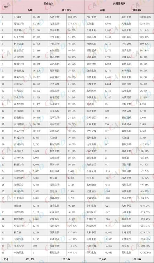 注:以下表格包括主板、中小板、创业板和科创板体外诊断相关上市公司