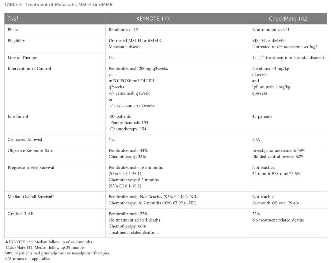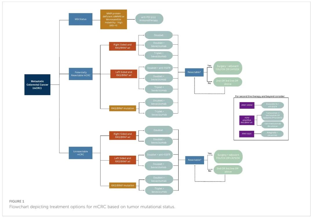 结直肠癌每年导至全球数十万患者死亡,预计未来二十年发病率将上升。对于转移性患者,细胞毒性药物治疗选择仍然有限,生存率提升甚微。因此,重点已转向识别结直肠癌突变和开发靶向药物。本文基于转移性结直肠癌分子变异,回顾了最新治疗进展。 研究背景 在美国,结直肠癌(CRC)发病率和死亡率仍然较高,仅2023年,估计就有153000例新诊断病例和超过52000例死亡病例。近四分之一的患者在出现症状时已发生转移(mCRC),而另外20%的患者最初诊断为局部疾病,随后进展为IV期疾病。IV期疾病预示着预后很差,估计5年生存率仅为14%。虽然在过去几十年中,美国和全球所有分期的CRC生存率都有所提高,但mCRC生存率保持稳定,没有显著进展。因此,广泛了解mCRC的分子谱以及开发相关靶点,对于治疗进展和改善患者预后非常重要。本综述基于mCRC分子特征,回顾了最新的试验数据,有助于改善治疗选择。 EGFR抑制剂 EGFR在细胞信号通路中的作用及EGFR抑制剂 许多已知的人类肿瘤的繁殖是由表皮生长因子受体(EGFR)及随后的信号通路激活驱动的。激活配体与EGFR结合导至EGFR酪氨酸激酶磷酸化,触发参与细胞增殖和代谢的下游信号通路。EGFR涉及多条通路,包括磷脂酰肌醇3激酶(PI3K)/Akt/哺乳动物雷帕霉素靶标(mTOR)通路以及RAS/RAF/丝裂原活化蛋白激酶(MAPK)通路。这些通路的激活或失调或敏感反馈环的不平衡导至促进细胞存活、抗细胞凋亡、增殖、血管生成和转移潜力的基因转录。 西妥昔单抗和帕尼单抗是针对EGFR的单克隆抗体,用于治疗转移性结肠癌。西妥昔单抗是一种嵌合型IgG-1单克隆抗体,而帕尼单抗是一种重组人源化IgG-2κ型单克隆抗体,两者都可竞争性抑制EGFR细胞外配体,限制上述导至肿瘤发生的异常细胞信号通路。两者疗效相似,西妥昔单抗更容易导至过敏反应,风险比约为5.47。这种过敏反应可能继发于先前开发的针对西妥昔单抗重链Fab部分存在的半乳糖-α-1,3-半乳糖的IgE抗体。这种预先存在的IgE抗体在美国东南部较常见,被认为与区域暴露有关。 RAS突变状态与EGFR抑制剂疗效 在mCRC中,编码参与EGFR介导的细胞信号通路的蛋白的基因(特别是KRAS,NRAS和BRAF)突变与抗EGFR治疗缺乏反应有关。RAS基因家族突变导至蛋白表达,造成RAS/RAF/MAPK信号通路的不适当组成性激活,不太可能受到上游EGFR与激活配体相互作用受到抑制的影响。因此,检测这些突变非常重要,使这些突变携带者不进行无效治疗,避免潜在严重毒性和费用。 2008年,一项研究首次评估了EGFR抑制剂在mCRC中的应用,比较了西妥昔单抗与最佳支持治疗(表1)。作者发现,接受西妥昔单抗治疗的KRAS野生型肿瘤患者OS显著改善(9.5 vs 4.8个月; HR 0.55; 95% CI 0.41-0.74),而KRAS突变肿瘤患者的OS或PFS没有差异(表1)。随后有研究探索了EGFR抑制剂与细胞毒性化疗联用。 表1. 转移性结直肠癌关键临床试验,按肿瘤特征分类 一项分析回顾了三项随机对照试验,比较了mCRC患者各治疗阶段化疗或最佳支持治疗联合或不联合帕尼单抗治疗的结局,得出的结论是,KRAS突变mCRC患者不太可能从EGFR抑制剂中获益(表1)。同样,CRYSTAL试验中,未经治疗的mCRC患者随机接受FOLFIRI联合或不联合西妥昔单抗治疗,亚组分析发现,与仅接受FOLFIRI治疗的患者相比,接受FOLFIRI和西妥昔单抗治疗的KRAS外显子2野生型肿瘤患者的中位PFS更长(9.9 vs 8.7个月; HR 0.68; 95% CI 0.50–0.94; p = 0.02)。对CRYSTAL试验数据的更新分析显示,接受西妥昔单抗治疗的患者总生存期(OS)更长(23.5 vs 20.0个月; p = 0.009),这种优势主要来自于RAS野生型肿瘤患者(HR 0.69; 95% CI 0.54-0.88)。RAS突变肿瘤患者未实现生存获益(1.05; 95% CI 0.86-1.28)。在III期PRIME试验中也观察到了类似的情况,该试验比较了FOLFOX联合或不联合帕尼单抗用于未经治疗的mCRC患者的疗效(表1)。接受FOLFOX加帕尼单抗的KRAS和NRAS野生型mCRC患者PFS(HR 0.72; 95% CI 0.58-0.90; p = 0.004)和OS(HR 0.77; 95% CI 0.64-0.94; p = 0.009)改善。重要的是,KRAS/NRAS突变患者PFS较差。这些结果反映了当前的临床实践,RAS野生型肿瘤患者采用抗EGFR治疗,而RAS突变肿瘤患者避免这类治疗,因为缺乏疗效或可能导至更糟糕的结果。图1展示了基于突变状态的推荐治疗方案。 图1. 转移性结直肠癌基于肿瘤突变状态的治疗方案流程图 原发性肿瘤位于哪一侧与EGFR抑制剂疗效 EGFR抑制剂疗效与原发性结肠肿瘤位于哪一侧相关。这被认为是肿瘤位于哪一侧替代不同累积分子亚型的结果。 一项多中心分析纳入了75 例RAS 和 BRAF 野生型mCRC患者,这些患者接受了西妥昔单抗单药,帕尼单抗单药或伊立替康加西妥昔单抗(任何治疗阶段)治疗,分析发现,右侧原发性肿瘤患者未观察到缓解,而左侧原发性肿瘤患者的缓解率为 41%(p = 0.003)。左侧肿瘤患者的无进展生存期(PFS)(2.3 vs 6.6个月)也更长(HR 3.97; 95% CI 2.09–7.53; p < 0.0001)。 对具有里程碑意义的CRC试验进行回顾性分析,也发现了这一现象。在上面提到的患者随机分配接受FOLFIRI加西妥昔单抗或仅FOLFIRI治疗的CRYSTAL试验中,以及在比较FOLFIRI加西妥昔单抗与FOLFIRI加贝伐珠单抗的FIRE-3试验中,加用西妥昔单抗的RAS野生型左侧肿瘤患者客观缓解率(ORR)、PFS和OS较优,而右侧野生型肿瘤疗效甚微(表1)。CALGB/SWOG 80405显示,右侧CRC预后较差,此外,在接受西妥昔单抗联合化疗时,KRAS野生型右侧肿瘤相比KRAS野生型左侧肿瘤,中位OS明显更差(16.7个月(95% CI 13.1-19.4)vs 36个月(95% CI 32.6-40.3))(表1)。