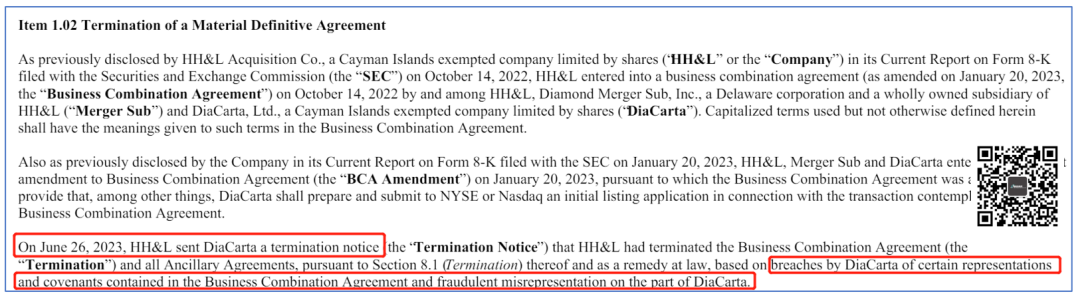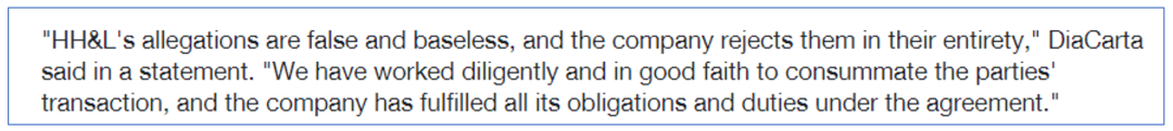 “帝基“不稳 PS:这国内译名太霸气了,一度让人以为是不可能被注册下来的。 DiaCarta是一家总部位于美国加州Pleasanton的分子诊断开发公司,在国内设有实体:南京帝基生物科技有限公司。 学过历史的大家都知道,南京肯定不能作为帝基的,懂得都懂。 2023年6月30日,SPAC(Special Purpose Acquisition Company,特殊目的收购公司,又称空白支票公司)公司HH&L Acquisition Co在向SEC提交的文件中表示,2023年6月26日公司向DiaCarta递送了合并终止通知。 也就是说,DiaCarta通过SPAC上市这条路,目前看是废了。至于原因,HH&L给出的是DiaCarta违反了业务合并协议中的某些陈述和条款,并且指责DiaCarta欺诈性虚假陈述。 对此,DiaCarta直接回怼表示HH&L指控虚假、毫无根据,公司对此完全否认。不仅如此,公司尽职尽责完全履行了合同的约定。 好了,成了罗生门了,总结下来就是“帝基“不稳啊。 背景深厚 HH&L(厚和投资)是一家SPAC公司,母公司成和集团。 所谓SPAC公司,简单来说就是一个造出来上市的“壳“公司。 人们发现,上市公司作为一个壳进行反向收购借壳上市有点复杂,符合要求的壳少之又少,往往还有既往债务等历史负担。 那么有没有一种办法,批量复制一批没有历史负担的“壳“上市公司呢? 聪明,太聪明了,这就是金融创新的一种。 SPAC公司没有业务,确切的说业务只有一个,那就是寻找还没上市的而且需要上市又不想通过IPO这么复杂程序上市的标的。 HH&L来头很大,董事长是Kenneth Hitchner,曾任高盛亚太区(除日本)总裁,药明生物独董、药明康德高级顾问、基石药业非执行董事。 当然,HH&L的背景并没有这么简单,另一位创始人李琦是前中国长城资产(国际)CIO、COO。 而这还不算完,HH&L的顾问委员会主席方风雷是厚朴投资的创始人和主席。 所以你说,这家公司为什么叫厚和呢? DiaCarta DiaCarta美国实体成立于2011年(一说2010),创始人张爱国博士(Aiguo Zhang)毕业于北京师范大学后进入中科院攻读毒理,硕士毕业后进入Simon Fraser University,学习药理和毒理。 博士毕业后在马萨诸塞大学阿默斯特分校从事博后工作,随后进入Bio-Rad、Panomics、Affymetrix。 DiaCarta公司的CTO是原Illumina高级研究员Michael Sha博士,曾经参与过iseq-100的研发。 DiaCarta的产品线很丰富,涵盖NGS LDT检测和分子诊断IVD产品。 其专利的XNA技术(Xenonucleic Acid,核酸类似物),能够提供更灵敏、更快和更便宜的qPCR检测产品, 2021年的公司营收4200万美元,其中新冠检测相关的营收3200万美元。 当期其中公司的毛利率68%,盈利1200万美元。 完美合作 2022年10月,HH&L和DiaCarta达成协议,双方将进行合并。 合并后,DiaCarta将获得4.14亿美元现金,占股44.8%。 当时,Zhang博表示对即将到来的合作非常激动,而HH&L这边Kenneth Hitchner也表示我们非常高兴与帝基合作,因为我们相信这是一家有望在市场中取得显著增长的公司,其尖端平台技术也能为整个行业的发展做出贡献。 这,看起来是个完美的合作。 结果,还不到一年,就闹了个大红脸。 至于到底在哪出了问题,也许我们永远不会知道,只会留下江湖传说。 西边不亮东边亮 2022年8月2日,DiaCarta在国内的实体帝基生物拿到了南京2022年独角兽的称号,与世和基因、传奇生物并列。 时间往前回溯,早在2017年帝基生物就拿到了3亿元人民币的A轮融资。 你看,其实也许大概可能DiaCarta不太需要在美国上市,国内也是大有可为嘛。 毕竟,也许西边不亮东方亮嘛。 |