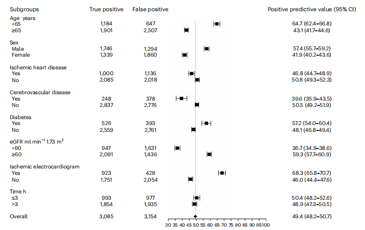 在没有心肌损伤的患者中,小于5 ng /L的排除阈值的阴性预测值为99.6。在出现心肌损伤的患者中,性别特异性的第99百分位参考上限的阳性预测值为49.4。在所有亚组中存在显著的异质性,在年龄大于65岁、女性和缺血性心脏病和肾功能受损的患者中,阳性预测值较低(如下图)。