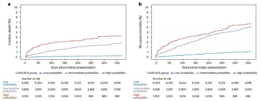 1年后,外部验证队列中有144例(1.4%)死于心脏原因,317例(3.1%)死于任意原因。与就诊时被CoDE-ACS识别为中概率或高概率的患者相比,低概率心肌梗死的患者在30天内(心源性死亡率:0.1 vs 0.5和1.8%;全因死亡率:分别为0.1vs 0.9和2.0%)以及1年后(心源性死亡率:0.3 vs 2.8和4.2%;全因死亡率:1.1 vs 6.1和6.7%)的心源性死亡率和全因死亡率较低(如下图)。