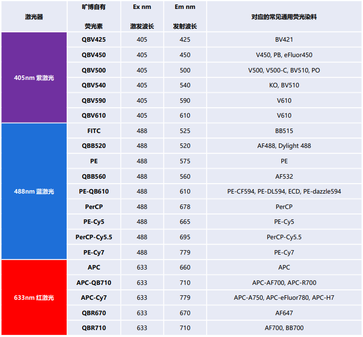 旷博生物作为国内流式龙头企业,集原料、试剂和仪器研发、生产质造和销售为一体,深耕流式领域40余年,打破国外技术垄断,致力于开发更多新型荧光素种类和抗体以满足临床和科研需求。随着多激光多色及光谱流式细胞仪等更高通量仪器的出现,旷博生物随之开发出应用于多色实验的小分子QB系列荧光素,目前已拥有20余种荧光素供客户选择(表1)。