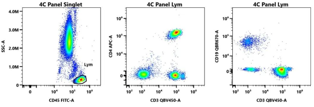 图8. 多色实验中QB染料相互兼容且可以和其他类别染料进行灵活兼容。外周血加指示的抗体CD45 FITC/CD3 QBV450/CD19 QBR670/CD4 APC进行孵育,裂红后在光谱流式NL-CLC上进行检测。可以看到QB染料无需特殊缓冲液、使用灵活,适用于光谱流式。