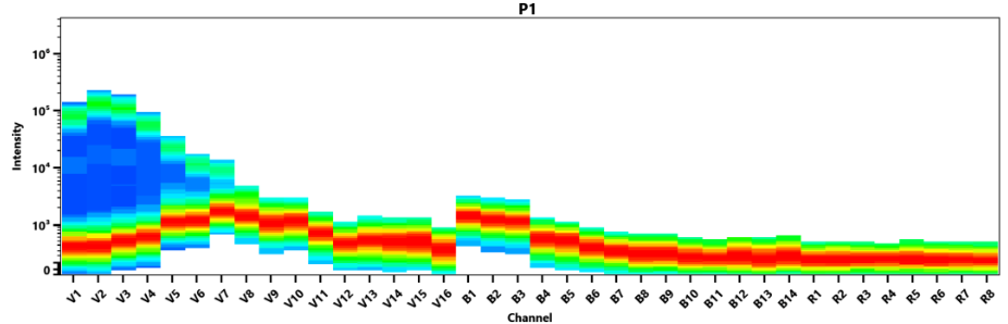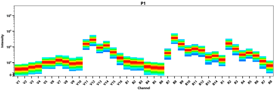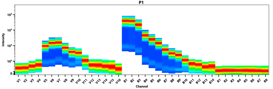 图7. QBV425单染样本在光谱流式上的光谱图,可以看到紫光为主要激发峰,而别的激光均无传统染料类似的次要激发峰。