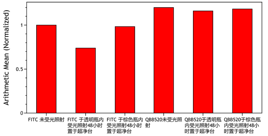 图2. 经过优化的小分子荧光染料稳定且与抗体结合更加稳固,QB染料可以减少光漂白效应,从而增加QB染料的光稳定性。如图,CD45 QBB520和FITC同时经过不同的处理(未受光照射、于透明瓶内受光照射48小时、于棕色瓶内受光照射48小时)。随后,新鲜外周血分别取上述处理的抗体进行孵育染色、裂红后上机检测。可以看到CD45 QBB520 的光稳定性明显优于传统小分子染料。