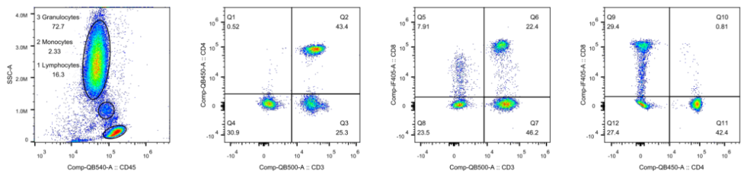 图9. CD45-QB540/CD3-QB500/CD4-QB450/CD8-QB425亚群配色组合在光谱流式NL-CLC上使用,细胞分群良好。
