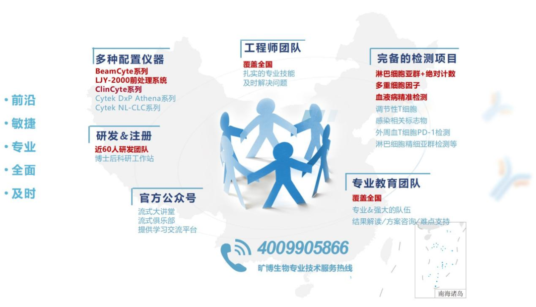 旷博生物荧光素研发平台经过40余年的深耕细作,独具特色和优势的QB系列荧光素,直击国际企业卡脖子问题,迎合现代流式技术发展和市场需求,显著提高了流式检测结果的灵敏度和成功率。旷博生物作为国内流式龙头企业,流式平台提供流式细胞仪+淋巴细胞亚群前处理仪+TBNK及精细淋巴细胞亚群+细胞因子检测+血液科流式精准检测应用+感染检测等整体解决方案。配备国内大规模的专业工程师、技术及医学团队支持,24小时服务热线一触即连,多类型学术支持,协助流式项目顺利开展。
