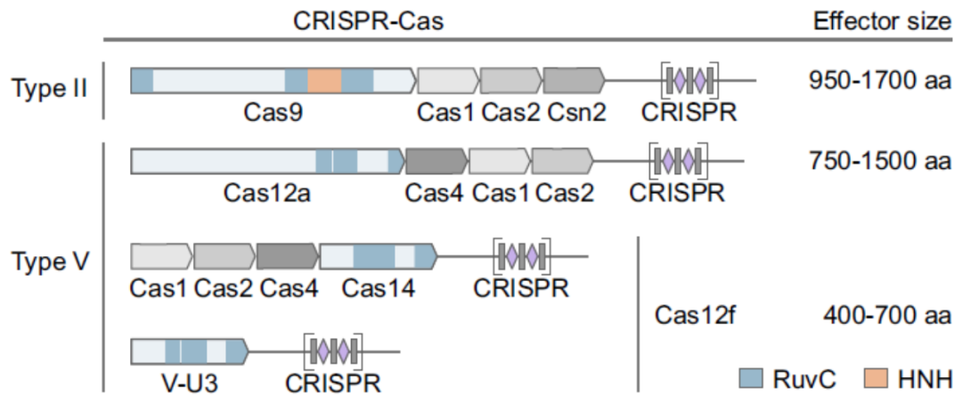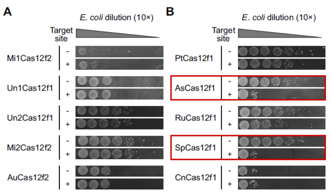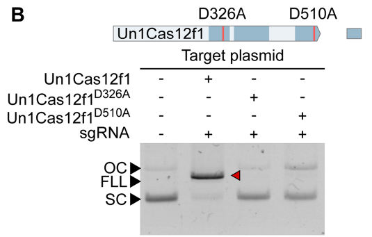 Virginijus Siksnys团队2020年在《Nucleic Acids Research》发表的文章PAM recognition by miniature CRISPR–Cas12f nucleases triggers programmable double-stranded DNA target cleavage[1]。文章表明,Cas12f(旧称Cas14)不但能够靶向ssDNA[2],而且也具有PAM依赖性靶向dsDNA的活性。这与前期Jennifer Doudna团队发现Cas12f只能切割靶标ssDNA的结论不同[2]。因此,Siksnys的工作不仅修正了我们之前对于Cas14家族切割靶标的认知,更为Cas14家族的使用提供了更广阔的前景。 大家熟悉的Cas9、Cas12、Cas13蛋白,它们的分子量都偏大,这对于将该系统递送入细胞是不利的,这可能会限制它们的某些应用。而该文所研究的Cas12f蛋白的分子量则普遍只有400~700 AA,几乎是最小的Cas9或Cas12蛋白的一半。 与Cas12a蛋白的比较可以发现,Cas12f主要差异位于蛋白的N端,Cas12f蛋白的N端明显要短了许多(图1)。由于这一差异,先前的研究认为其可能是V型CRISPR/Cas系统进化的残留物或中间体,可识别和剪切ssDNA,而不具备识别和剪切dsDNA的能力[2]。 图1.Cas14在蛋白N端比Cas9与Cas12短很多[1] 研究者使用了之前报道的方法[4]来寻找Cas12f所对应的PAM序列。他们首先构建了一个含7-bp随机PAM的质粒文库(图2),靶标的spacer长度取决于这些Cas12f系统在各自菌株中观察到的平均长度。接着,他们体外转录并纯化了这些Cas12f的sgRNA,sgRNA中的spacer长度暂定为20 nt。然后,他们在大肠杆菌中表达各种Cas12f蛋白,收菌后在含PMSF的lysis buffer中超声裂解,直接取裂解产物的上清,加入RNase抑制剂与纯化后的相应sgRNA,得到Cas12f/sgRNA复合体。 下一步,该复合体被直接用于剪切随机PAM文库,剪切完成后的双链DNA为粘性末端。接下来,为了测序,要先用T4 DNA聚合酶补齐为平末端,再用Taq酶对3′端进行了加A处理,去除RNA并纯化后,将加A产物与3′-dT的双链DNA接头进行连接,之后即可进行PCR扩增并测序得到这些剪切产物中的PAM。最后,研究者们就得到了各种不同Cas12f对PAM的偏好(图3)。结果表明,大多数Cas12f偏好富T的5′-PAM序列。 图3.不同Cas12f蛋白识别和剪切dsDNA的PAM序列偏好[1] 确定了这些Cas12f的PAM偏好后,研究者又进一步以纯化的Un1Cas12f1蛋白为对象,探索了其dsDNA剪切的最佳反应条件。结果表明,Un1Cas12f1是一种Mg2+依赖性的核酸内切酶,在低盐浓度(5-25 mM)下功能最佳,在∼37-50℃的宽温度范围内具有活性,最佳温度为∼46℃,sgRNA的最佳spacer长度为~20 nt。在此优化的反应条件下,Un1Cas12f1能够将超螺旋质粒DNA完全转化为线性形式(图4)。突变失活两处RuvC活性位点会消除这种剪切活性,证实了RuvC结构域对于这一剪切活性至关重要(图5)。 图4. 最佳反应条件下,Un1Cas12f1能够将超螺旋质粒完全转化为线性形式[1] 图5. Un1Cas12f1对dsDNA的剪切需要依赖RuvC结构域[1] 他们首先在大肠杆菌中转入了一个质粒,该质粒可以表达Cas12f蛋白以及T7转录相应的sgRNA。接着,在该能够产生Cas12f与sgRNA的大肠杆菌中,通过电转化引入携带靶标序列的低拷贝质粒。最后,将这些细胞10倍梯度稀释后生长于含有诱导剂与抗生素的平板上。 图6.能表达Un1Cas12f1与转录sgRNA的质粒[1] 实验结果令人意外,大部分的Cas12f并没能干扰低拷贝靶标质粒的进入,与对照组的生长情况没有肉眼可见的区别(仅AsCas12f1与SpCas12f1产生了显著的质粒干扰)。不过,这与先前的一项研究结果是一致的——Un1Cas12f1不能耗尽大肠杆菌中的PAM质粒文库,这也可能是它没有被检测到PAM依赖性的dsDNA剪切活性的原因之一。作者在文中也没有对这一现象做进一步的推测(图7)。 图7.大部分Cas12f不能在大肠杆菌中产生显著的质粒干扰[1] 参考文献: [1].Karvelis T, Bigelyte G, Young JK, Hou Z, Zedaveinyte R, Budre K, Paulraj S, Djukanovic V, Gasior S, Silanskas A, Venclovas Č, Siksnys V. PAM recognition by miniature CRISPR-Cas12f nucleases triggers programmable double-stranded DNA target cleavage. Nucleic Acids Res. 2020 May 21;48(9):5016-5023. doi: 10.1093/nar/gkaa208. PMID: 32246713; PMCID: PMC7229846. [2].Harrington LB, Burstein D, Chen JS, Paez-Espino D, Ma E, Witte IP, Cofsky JC, Kyrpides NC, Banfield JF, Doudna JA. Programmed DNA destruction by miniature CRISPR-Cas14 enzymes. Science. 2018 Nov 16;362(6416):839-842. doi: 10.1126/science.aav4294. Epub 2018 Oct 18. PMID: 30337455; PMCID: PMC6659742. [3].Makarova KS, Wolf YI, Iranzo J, Shmakov SA, Alkhnbashi OS, Brouns SJJ, Charpentier E, Cheng D, Haft DH, Horvath P, Moineau S, Mojica FJM, Scott D, Shah SA, Siksnys V, Terns MP, Venclovas Č, White MF, Yakunin AF, Yan W, Zhang F, Garrett RA, Backofen R, van der Oost J, Barrangou R, Koonin EV. Evolutionary classification of CRISPR-Cas systems: a burst of class 2 and derived variants. Nat Rev Microbiol. 2020 Feb;18(2):67-83. doi: 10.1038/s41579-019-0299-x. Epub 2019 Dec 19. PMID: 31857715; PMCID: PMC8905525. |