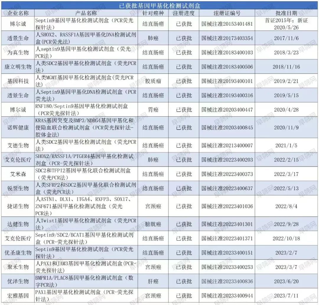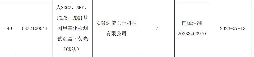 早筛网讯:7月18日,据国家药监局政务服务门户网站消息,安徽达健医学科技有限公司“人SDC2、NPY、FGF5、PDX1基因甲基化检测试剂盒(荧光PCR法)”获批,根据靶点信息,应该适用于结直肠癌早期检测。