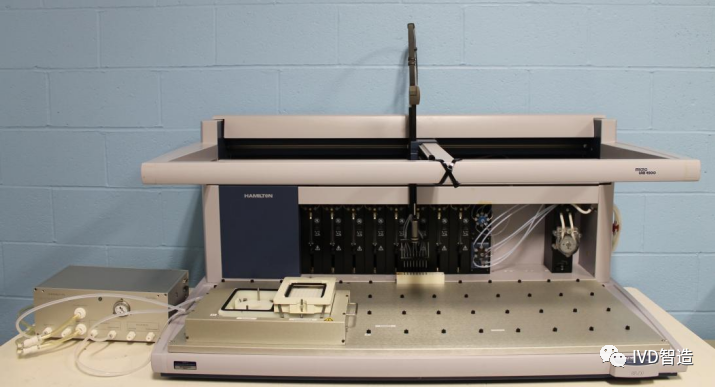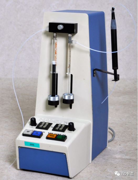 1955年,美国哈美顿成立。1968年克拉克·汉密尔顿在瑞士博纳杜兹(Bonaduz)成立了一家相同的公司瑞士哈美顿(Hamilton),以便为欧洲科学界生产这些注射器; 1971年,汉密尔顿公司(Hamilton)推出了数字稀释器,一种半自动直流电动机驱动的可调式移液装置,其使用了两个注射器作为移液活塞。 1974年,克拉克·汉密尔顿(Clark Hamilton)将哈美顿交棒给儿子史蒂夫·汉密尔顿(Steve Hamilton),史蒂夫·汉密尔顿在兄弟的支持下,销售额呈指数级增长,同时还进入化学品的自动化液体处理领域; 到了70年代年代后期,微处理器技术发展迅猛,工程师可以对马达和阀门功能序列进行编程,加上已经成熟的微量注射器技术,直接推动了全自动移液装置的发展。 1980年4名工程师在瑞士乡村Hombrechtikon创立了Tecan(帝肯),目标是开发测量、分析和实验室自动化设备。创立之初的办公场所是CEO兼联合创始人海因茨•阿普拉纳普(Heinz Abplanalp)家的乡村酒窖。 1980年,哈美顿推出第一台全自动的样本制备工作站Microlab 2000; 1983年Hudson Robotics公司在新泽西州成立,致力于成为微孔板自动化、实验室机器人、液体处理和定制软件驱动实验室自动化解决方案的领导者。推出的Hudson SOL是一款低成本、灵活且易于使用的自动移液器。1985帝肯加样器Samplers 500系列上市,这是第一款集过程控制的全自动移液工作站。 同样是1985年,哈美顿(HAMILTON)Microlab 2200上市,这是一款基于机械臂运动和具有管路系统的稀释分配器(Diluter)原理,采用8或12根固定距离的涂覆特氟龙钢针,由单任务的BASIC程序控制的样本处理系统; 1986年,美国加州Cetus公司推出Propette,一种小型的12通道、多微滴板液体转移装置,它具有在微量滴定板上操纵少量液体的能力,主要用于微板转移和洗板。最初是由Cetus工程师为白细胞介素-2自动化检测的需求而设计的,后来被改装为第一台PCR机器“Mr. Cycle”的一部分,非常受PCR工作者们的欢迎; 它由一个单轴定位平台组成,用于固定微孔板、移液器吸头和储液器,以及安装在z 轴上方的移液头和清洗头。随后,Cetus与Perkin Elmer(珀金埃尔默)的合作,将移液装置推广到生物技术的其他领域。
