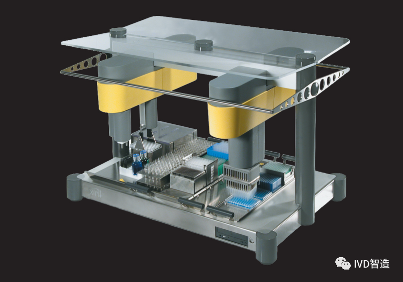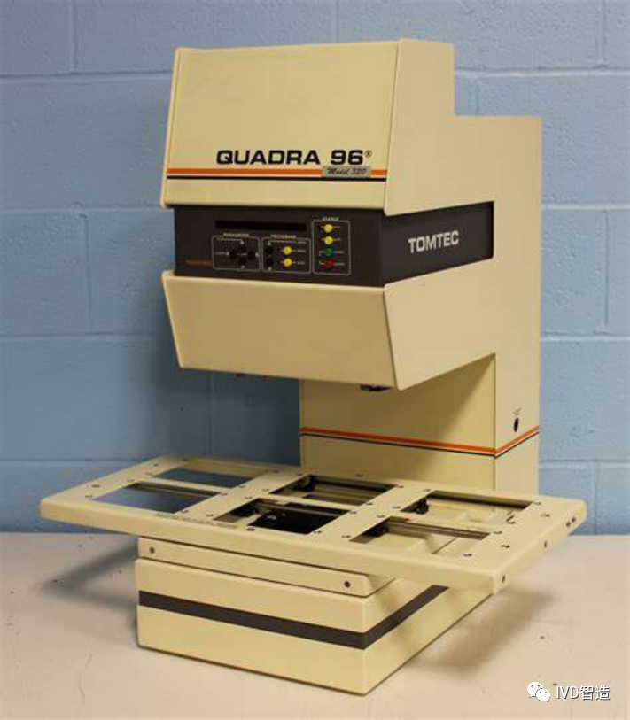 1990年,TomTec公司开发了第一个96通道的液体处理工作站Quadra96,它有一个定位台底座,用于放置微板、移液吸头和储液槽,在z轴上安装了一个96通道的移液头。 1992年哈美顿推出Microlab F.A.M.E Microlab F.A.M.E是一种全自动微孔板处理系统,可执行ELISA测试的所有必要步骤。同时它也是一个开放的系统。 该产品由插入和取出载玻片的两个主要部分组成。可以添加各种功能和实验步骤:孵育、洗涤和添加反应物、读取和解释临床结果。 1993年,海因茨•阿普拉纳普(Heinz Abplanalp)离开Tecan并创立了Rosys Instruments,5年后,Rosys被德国凯杰收购; 1994年帝肯推出管式和板式样本跟踪仪器。以及8通道机械臂(独立的Z轴和可移动的Y轴)。 同年,哈美顿推出紧凑型移液器单探头和多探头液体处理工作站Microlab 4000(下图),可选固定探头或一次性吸头,出色的低体积准确度和精密度,高效清洗系统,大容量范围,液体置换式移液技术,灵活配置和集成多种应用; 1997帝肯推出 REMP Large-Size Store™。 哈美顿MicroLab AT系列的最新版本Microlab AT plus 2问世(下图),Microlab AT plus 2具有全面的标本质量系统、加样质量保障系统,获得了美国FDA许可,用于血液筛查实验室。 2000年哈美顿推出Microlab STAR,STAR系列自动化液体处理工作站使用了空气置换、压缩导入-O形环扩张CO-RE、液体双传感(△C-△P)、任意加样程序可同时使用不同的TIP头等技术。 2001年帝肯发布了Genesis Freedom液体处理工作站; Genesis Freedom工作站是一个模块化,可扩展,高通量的系统,独特之处在于它能够接受多达三个机械臂,它还拥有业界最广泛的机器人机械手和配件选择,可以组合成多达九种不同的手臂配置。 2001年帝肯,卖掉Rosys后的第三年,海因茨•阿普拉纳普(Heinz Abplanalp)第三次创业,创立了中低端自动化液体处理工作站品牌Xiril; 2003帝肯成功推出新的Freedom EVO®平台。 Freedom EVO拥有高速高通量、灵活的载体模块配置、条码读取、每个Z轴独立液位探测的优点; 另外,Genesis两年累计售出5,000多套。 2005年帝肯庆祝成立25周年。推出压力探测移液器。