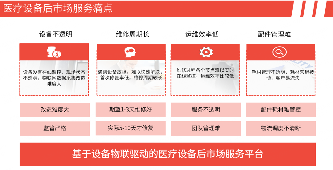 IVD(体外诊断)设备在医疗行业中发挥着重要的作用。它们能够帮助医生快速准确地诊断疾病,并且能够监测治疗效果和疾病进展。 然而,面对数量庞大而分散的设备管理,在设备缺少连接,已有平台缺乏以设备数据为基础的业务闭环的情况下,一心想要提升医疗服务品质、树立更高行业标杆的安必平急需打造可实现内外部数据拉通,以物联网为基础的售后服务及销售运营一体化的系统平台。 集团总部的工程师们如何能够第一时间了解各地设备的“健康状况”?能否根据设备的不同运行时长、耗材消耗情况提供针对性的维护方案?如何降低频繁全国出差的设备售后维护成本、提高售后效率,进一步提升医疗服务质量?如何提升服务质量,不断提升客户满意度,增加客户对安必平品牌的信任和支持? 医疗企业要进一步迈向数字化,首先就要解决设备智能化的第一关。工业互联网技术的发展,为安必平提供了全新的解题思路。 No.1设备物联 让全国设备运行状况了然于胸 成立于2005年的安必平是国内病理诊断领域首家上市公司,以自主研发为核心,形成了集 病理诊断试剂、医疗设备、第三方医学检验、远程病理诊断、人工智能、科研服务为一体的病理整体解决方案。 为了攻克更多病理科发展的问题,夯实行业领先技术水平,安必平确立了病理科“四化”(自动化、标准化、数字化、智能化)战略发展方向。 在医疗设备方面,安必平从2015年起就开始布局设备物联,希望基于物联网、售后管理、配件管理等功能搭建全新的服务运营系统,帮助医院、监测机构等用户达到高效、低耗的最佳效益,同时为进一步推进检验检测集成化、设备智能化以及诊断数据化的数字化转型打好基础。 然而,在推进医疗设备物联的道路上,安必平也并非一蹴而就。 2015年前后,物联网技术并未成熟,安必平前瞻性的战略无法落地。时间来到2019年,安必平携手一家外部供应商做定制开发,从零开始构建平台,然而定制的物联网硬件及平台收费非常高,并且交付的平台维护复杂,无法有效赋能企业进一步发展壮大。 基于前两次的教训,安必平希望找到一家能够提供软硬件一体化工业互联网解决方案的企业,最后,安必平找到了鲁邦通(广州鲁邦通物联网科技股份有限公司)。 鲁邦通为安必平提供了“体外检测仪+工业网关+定制化云端平台”的整体方案,其中: ➢用内置模组级物联网网关解决安装空间狭小、设备数据采集难的问题; ➢定制开发IVD设备管理云平台,实现设备资产盘点、状态监控、耗材用量预测、售后现场服务、客户订单处理等后服务功能。 ➢平台支持多用户、基于不同角色提供不同的数据权限功能,具备告警管理和数据分析,同时提供小程序便于移动管理。 目前,安必平对分布在全国各地的其中2000多台设备进行了物联网改造,实现了对设备位置、运行状况、耗材使用等数据的实时管理,轻松了解各地设备的运行状况。 No.2智能运维 将运维成本配置最优化 传统的设备维护依赖于客户的反馈和技术人员定期的上门服务,安必平的产品分布在全国各地,包括西藏等偏远地区。在以前,业务人员收到客户报修电话,安排出差到客户现场进行检修,而检修过程反反复复,临时需要一个未携带过去的配件,又要来回奔波,常常耗时十数天才能解决问题。 这样的设备维护方式,不仅运维压力大,在时间、效率等各方面都增加了不可预期的成本。 此外,由于每台产品使用时间至少可达八至十年,一年每台设备至少有一次巡检,而不同应用场景的产品使用频率又有着较大差异,部分使用频率较少的可能两三年损耗都很小,而使用频率大的可能三个月就得维保一次。 通过设备物联以及管理云平台实现设备智能化管理后,安必平能够主动获知设备实时运行情况,并根据远程监控的数据分析,做到主动、高效地提供服务,优化运维资源配置。 例如在线地图实时查看资产位置,防止资产丢失;根据各区域产品使用频率和检修频率,制定相应的巡检政策,优化运维团队管理,节约运维成本;根据各家用户耗材消耗速度,优化耗材配给服务,提升耗材销售。后续还将通过更多的数据去满足客户的潜在需求,从而实现业务的扩展。 此外,安必平可以提前了解设备故障情况、分析故障原因,为客户提供更加主动的运维服务。通过物联网技术手段,现场故障信息确认和排查可以从3个小时缩短至0.5小时,更换配件的时间从48小时缩短至12小时。 智能服务:大幅度提升售后现场服务维修效率 安必平实施了鲁邦通软硬件结合的工业互联网解决方案后,简化了设备维护的流程,提高设备运维效率,从而有效地保障设备正常运转,助力维护医院病理科良好运作,为病人的生命健康做贡献。 No.3设备智能化 为中国医疗设备走向海外保驾护航 病理诊断过程中涉及到多个环节,以往每个环节各有设备各有数据,而未来的发展趋势将是集成化与智能化。安必平与鲁邦通在设备联网与数字化方面展开合作,实现设备智能化,将有利于朝着诊断医疗集成化方向的探索与落地。 而集成化的设备,对稳定性有着极高的要求,一个环节上的错误,就会直接影响整个诊断结果的准确性。 因此,集成化的设备需要更多的包括传感器、网关等物联网设施去对数据进行高效采集和传输,从而可以不断完善产品。目前鲁邦通为安必平定制的软件平台已经上线,正推动业务发展。 在医疗