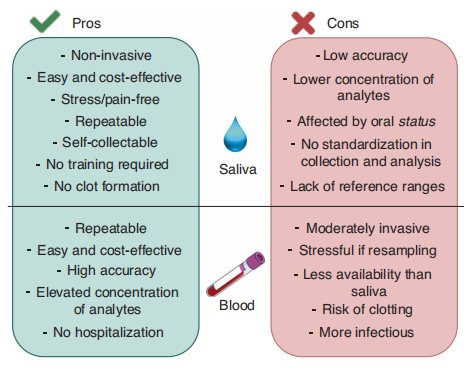 就像葡萄糖和皮质醇的情况一样,炎症标志物IL-6在血液和唾液之间也显示出显著的相关性。唾液收集的黄金标准方法是“被动流涎”,可以很容易地取样唾液。此外,有许多标准化的口腔采样方案,唾液收集可以通过可穿戴模块轻松实现自动化。然而,唾液是一种复杂的液体混合物,来自不同的微环境如牙龈缝隙,其中可能存在一种特殊的微生物种群,往往不同于其他口咽区域。